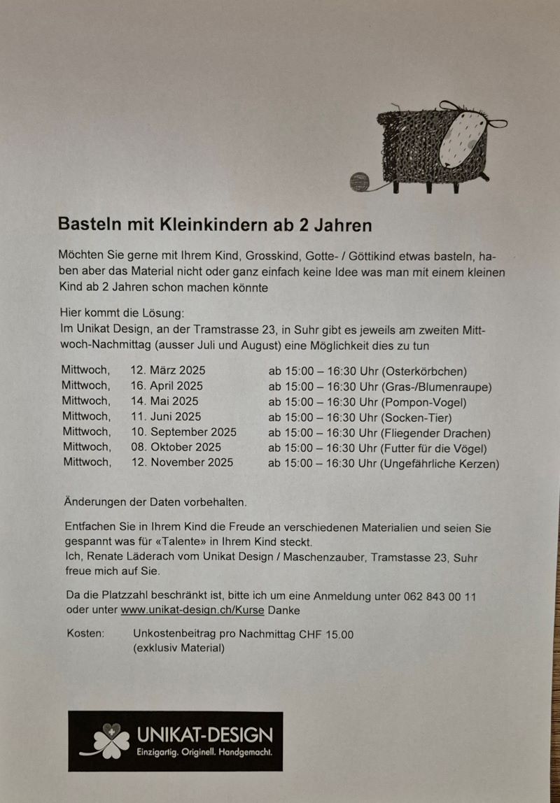 Da die Platzzahl beschränkt ist, bitte ich um eine Anmeldung unter 062 843 00 11 oder unter www.unikat-design.ch/Kurse Danke