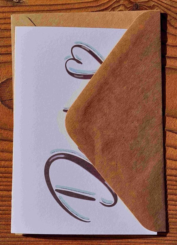 Gedruckt auf Fotokarton 300g. Die Innenseite kann gut beschrieben werden. Die Klappkarte hat geschlossen das Format DIN A6 (14.8 cm x 10.5 cm). Der Umschlag ist aus Kraftpapier.