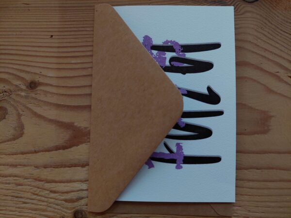 Gedruckt auf Aquarellpapier 300g. Die Innenseite ist glatt und kann gut beschrieben werden. Die Karte hat geschlossen das Format DIN A6 (14.8 cm x 10.5 cm). Der Umschlag ist aus Kraftpapier.