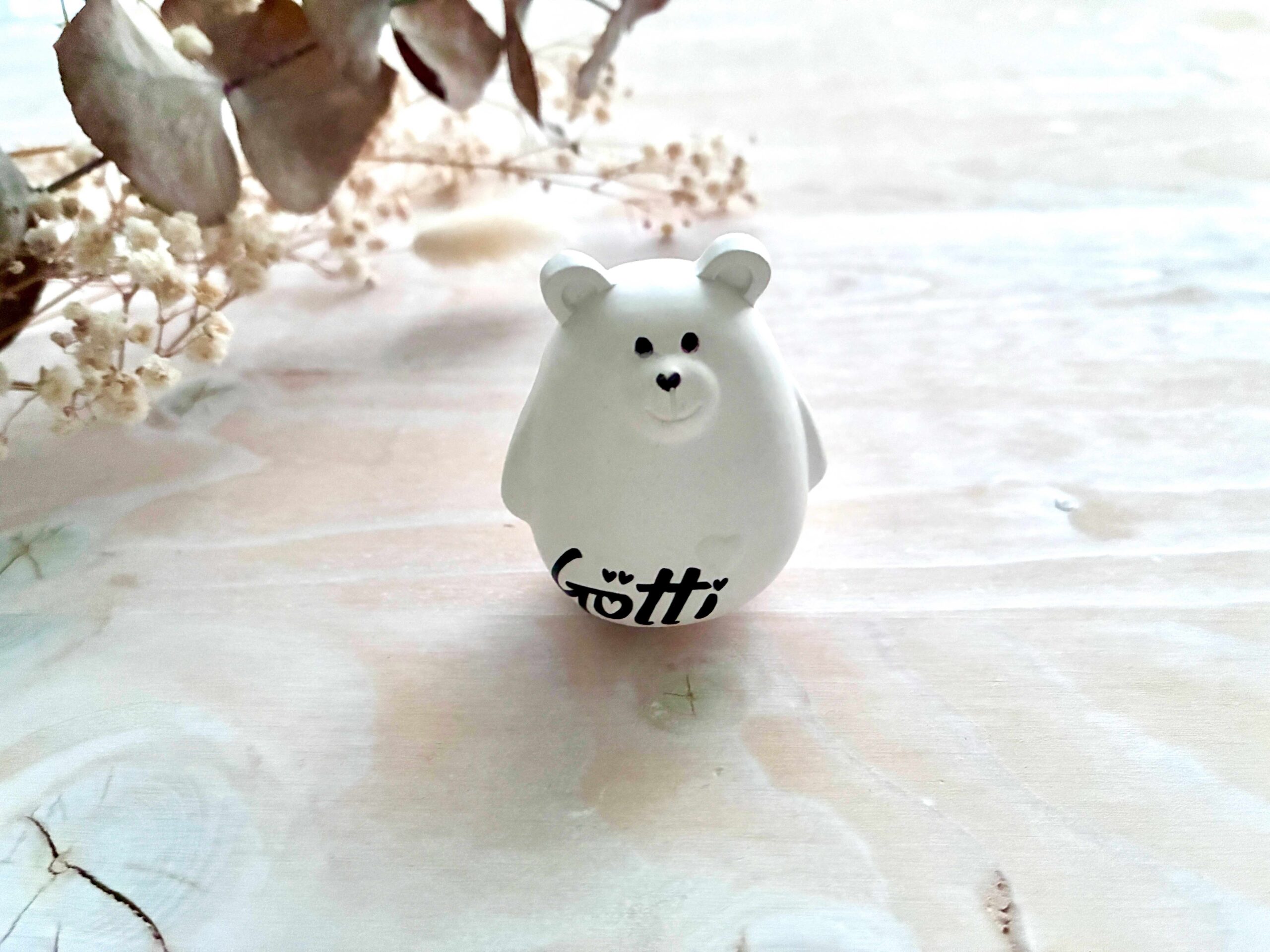 Der Bär wird von Hand aus feiner Keramikgiessmasse (Raysin/Keraflott) gegossen und mit einem schwarzen Vinylschriftzug veredelt.