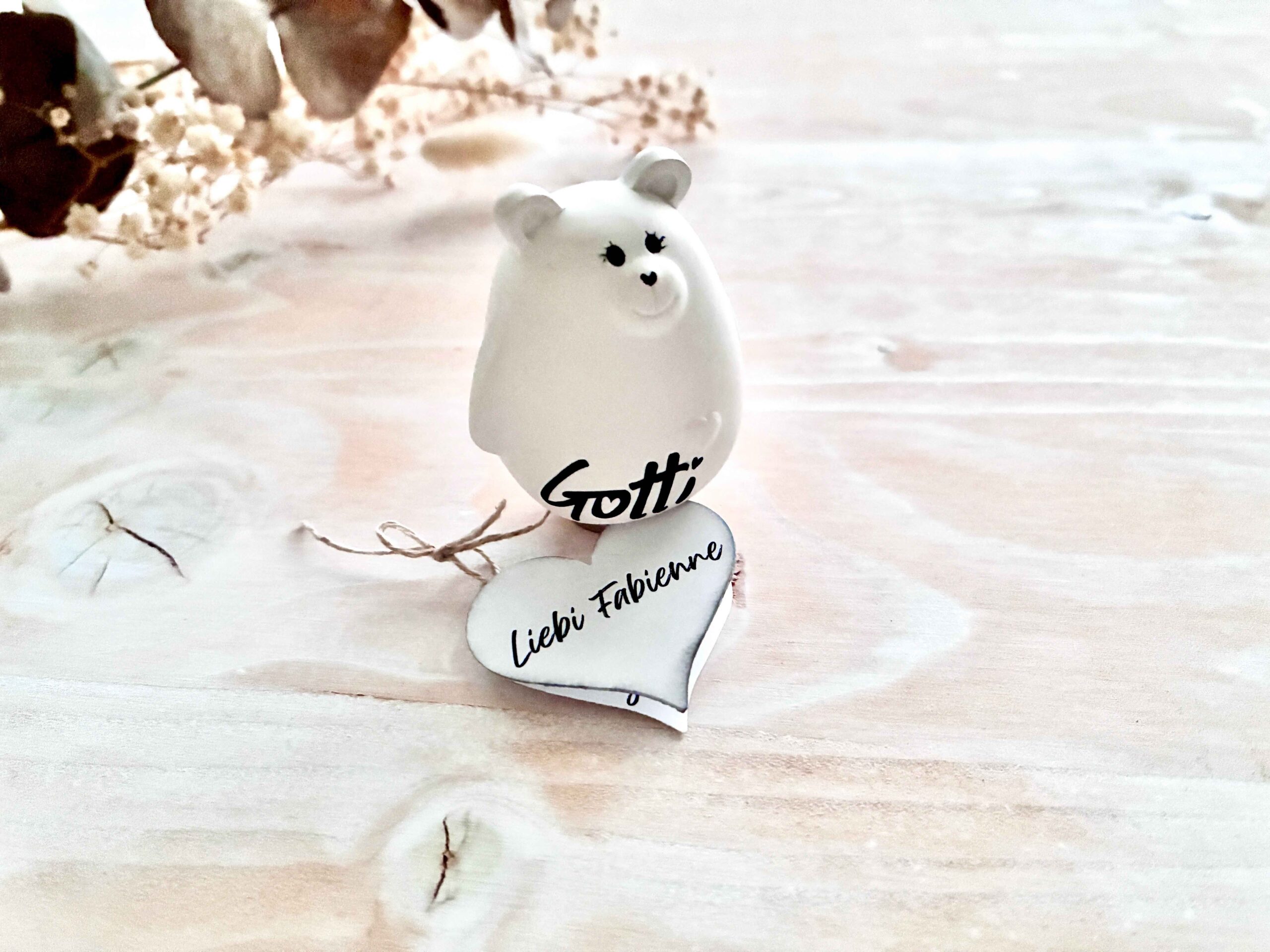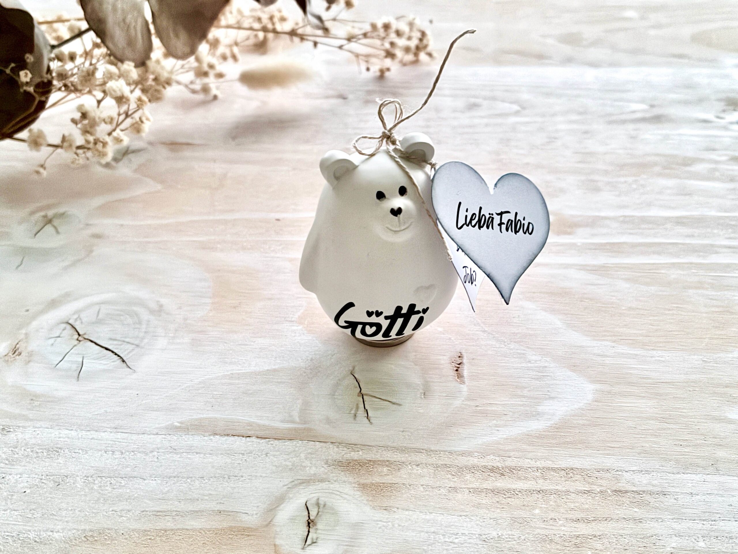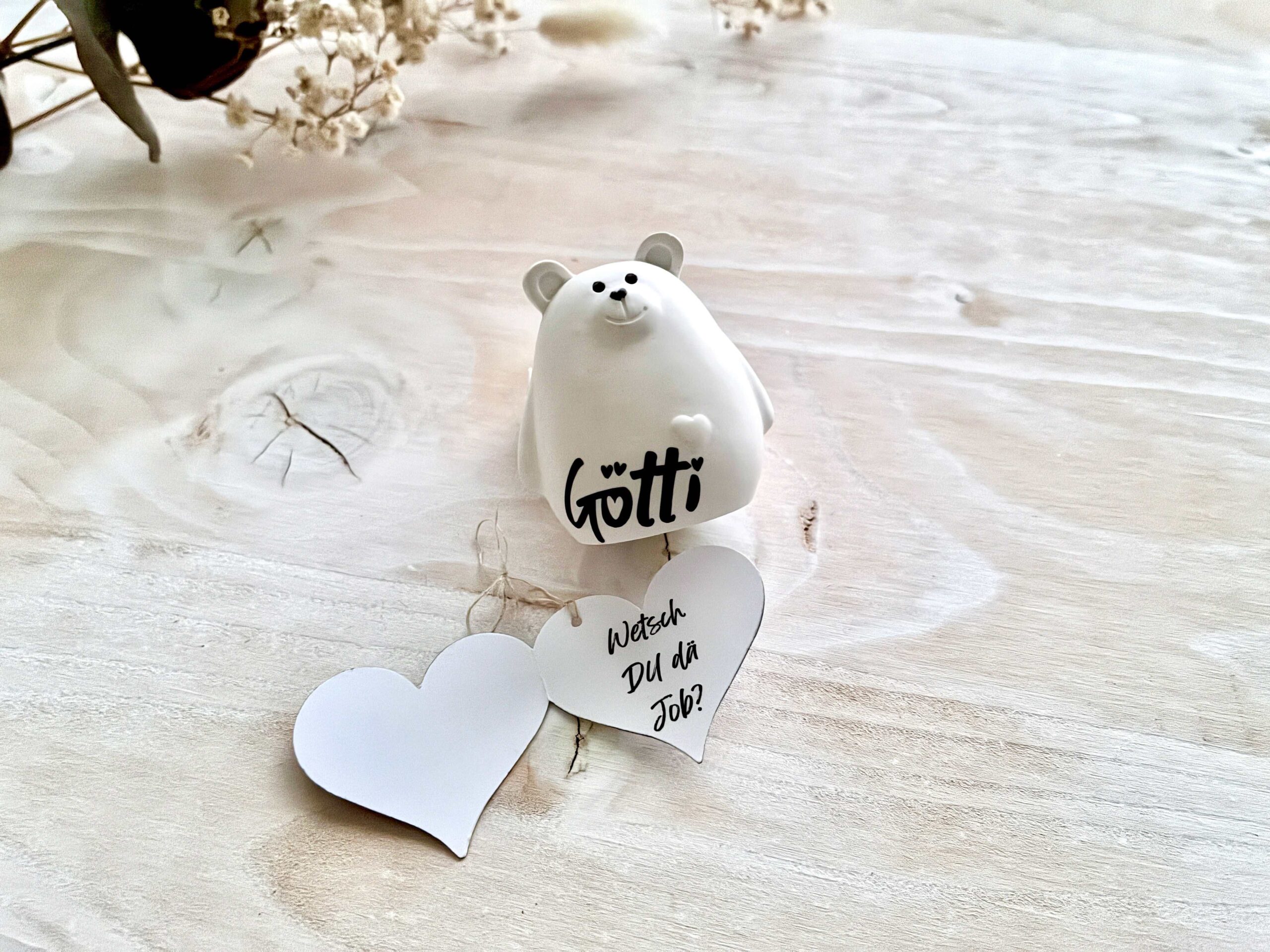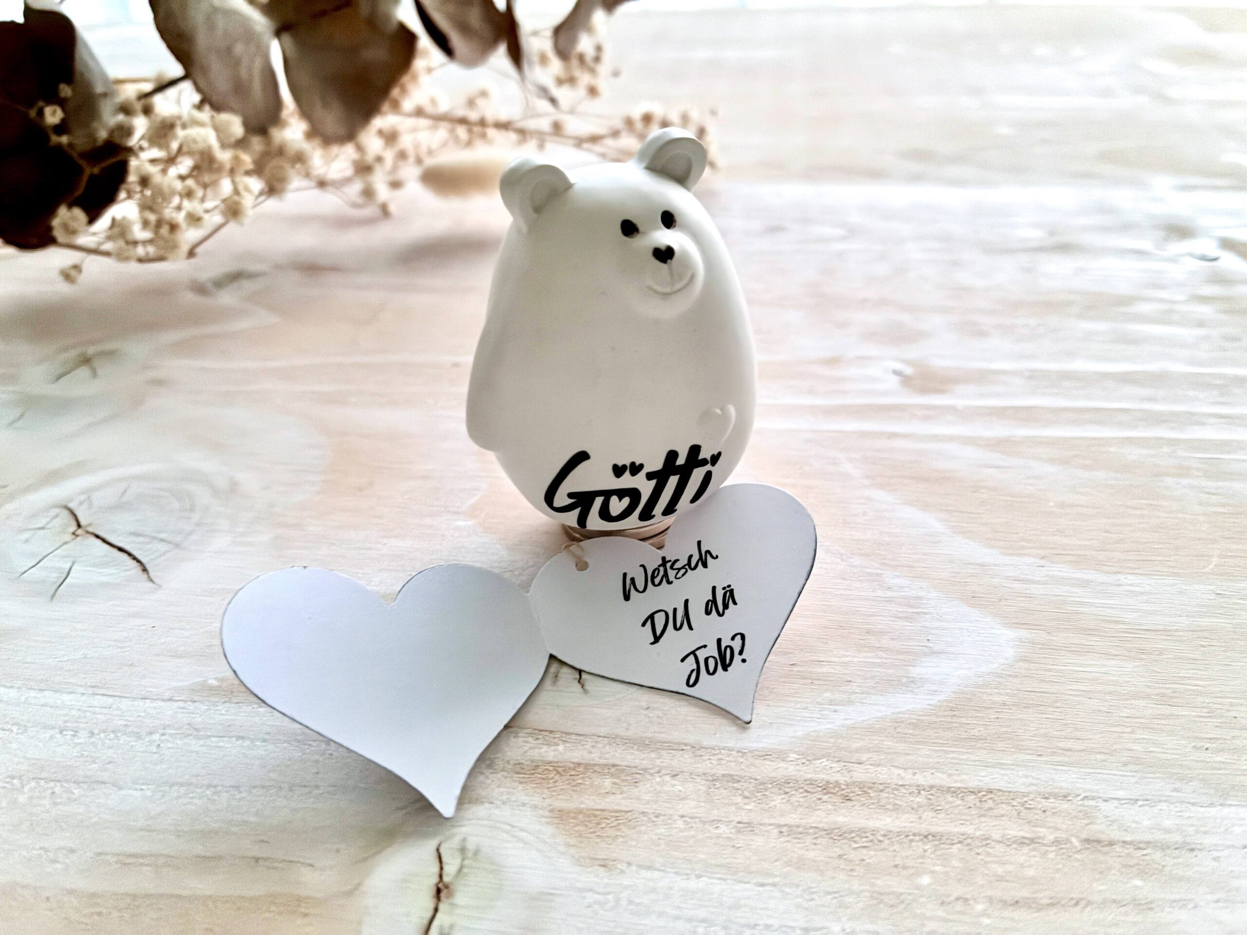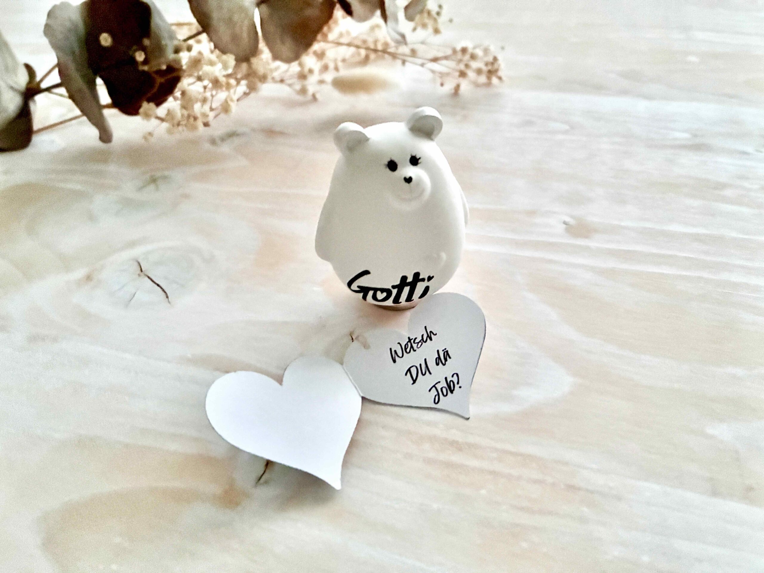 Dieser kleine handgegossene Bär trägt ein personalisiertes Herz-Kärtchen mit deiner ganz persönlichen Frage an die zukünftige Gotti oder den Götti – ein emotionaler Überraschungsmoment, der in Erinnerung bleibt.