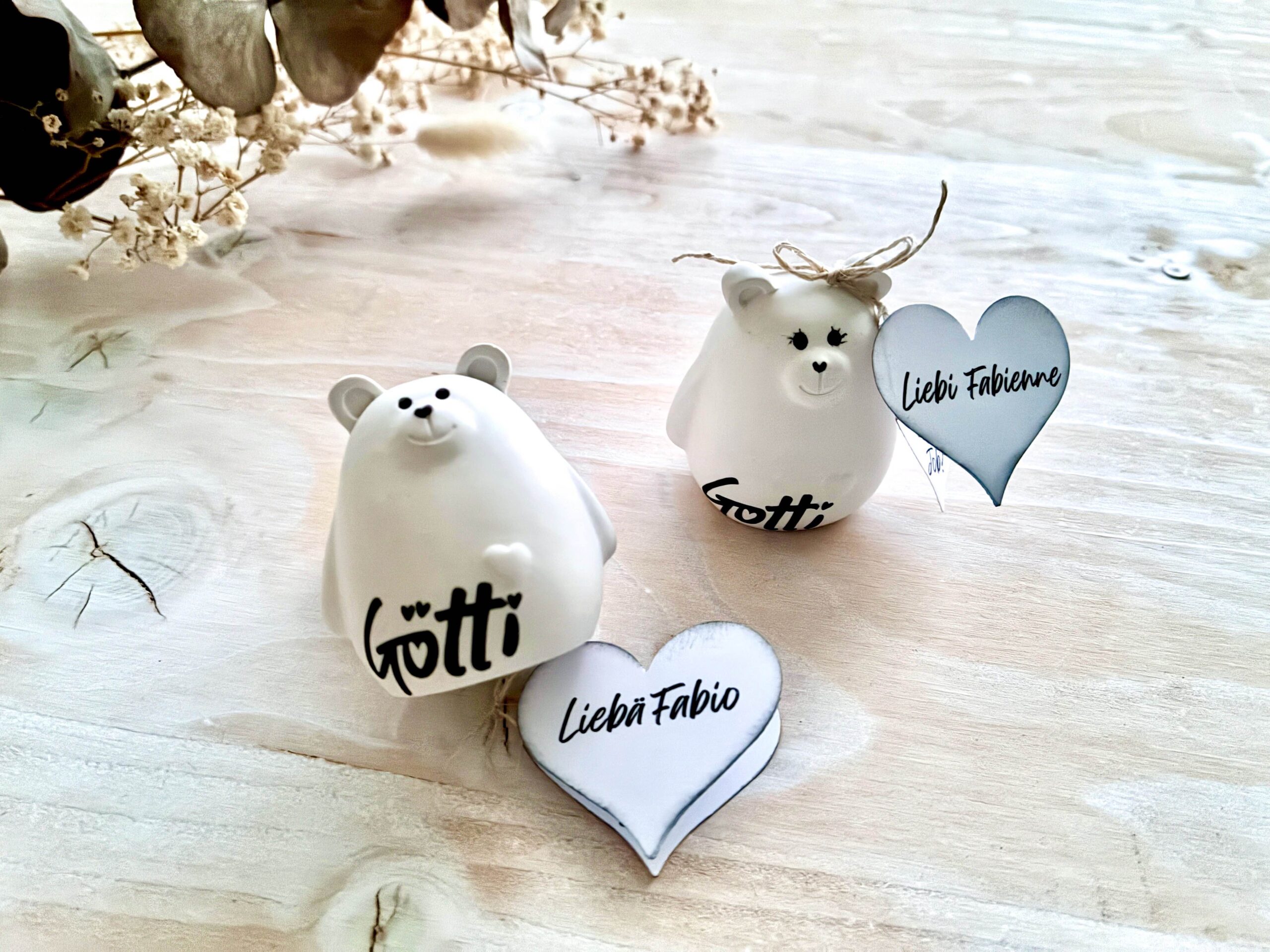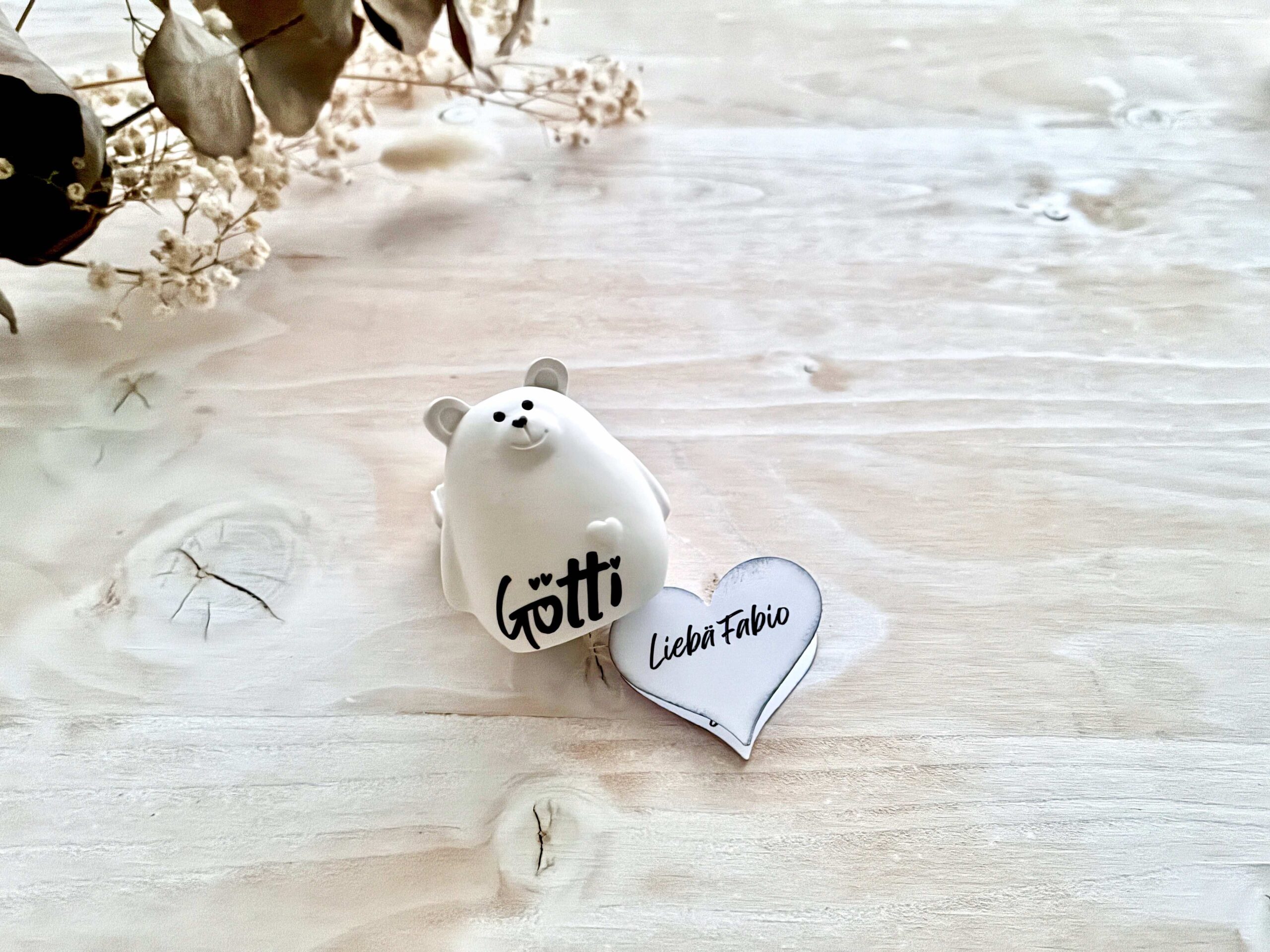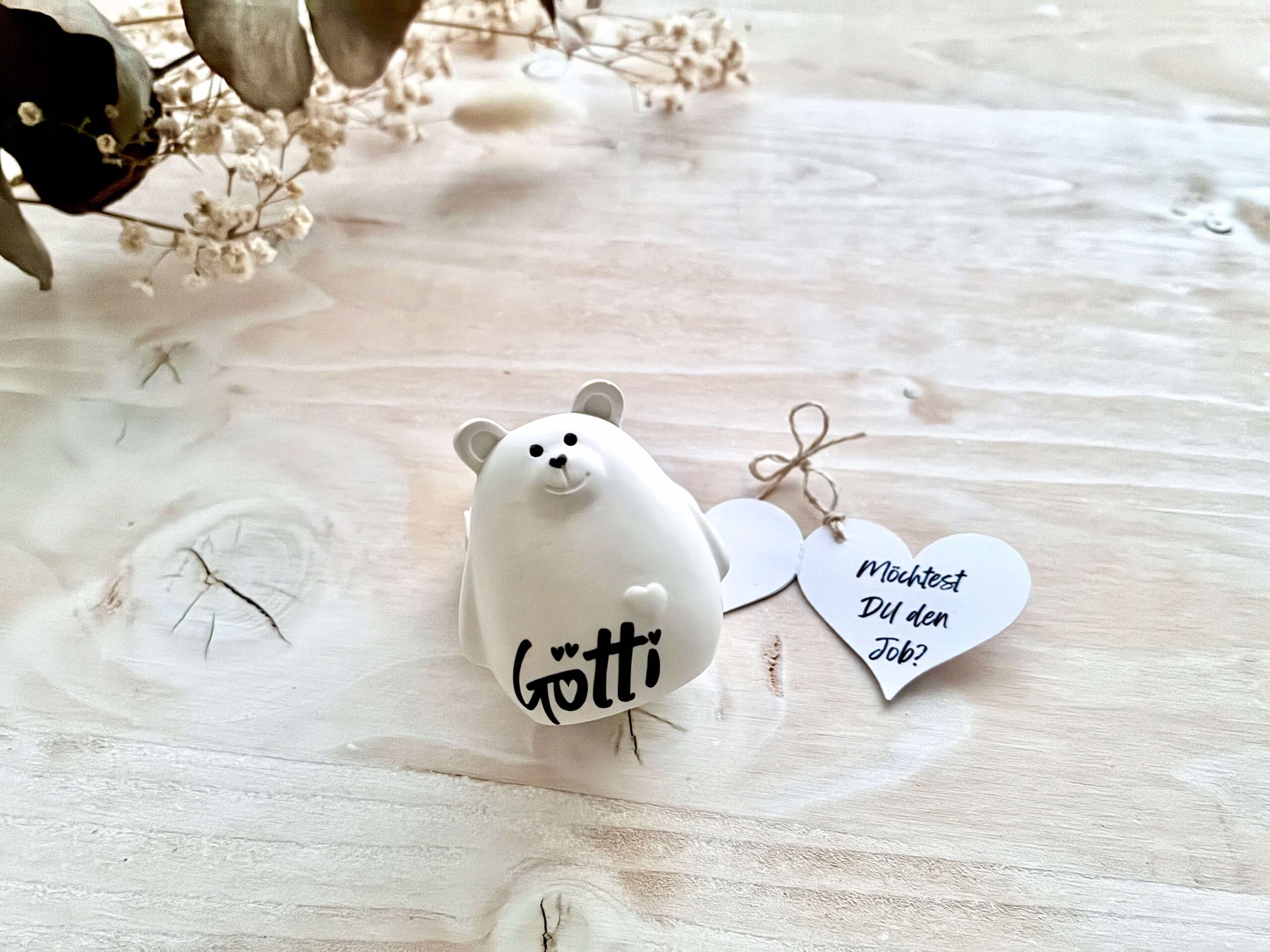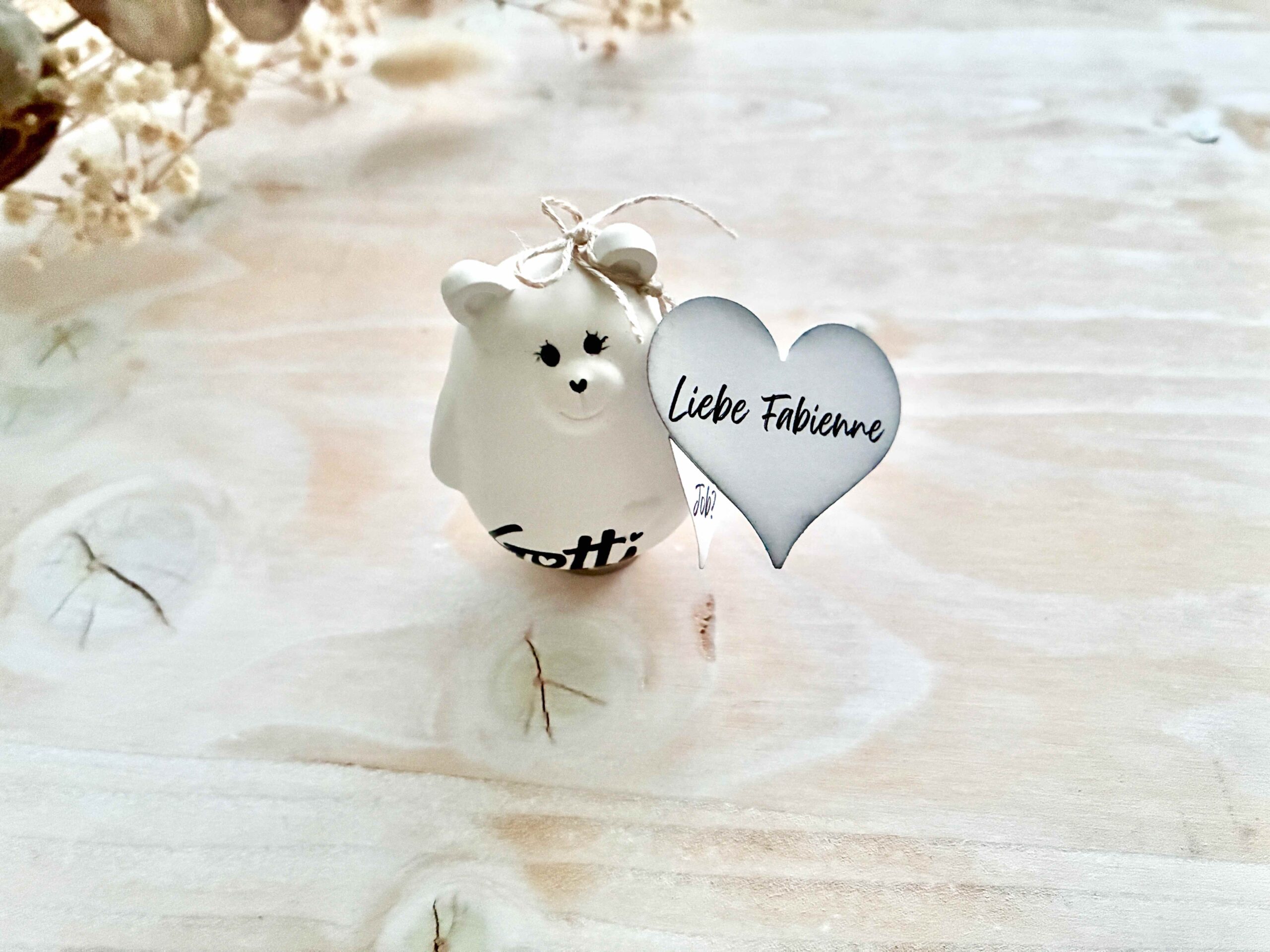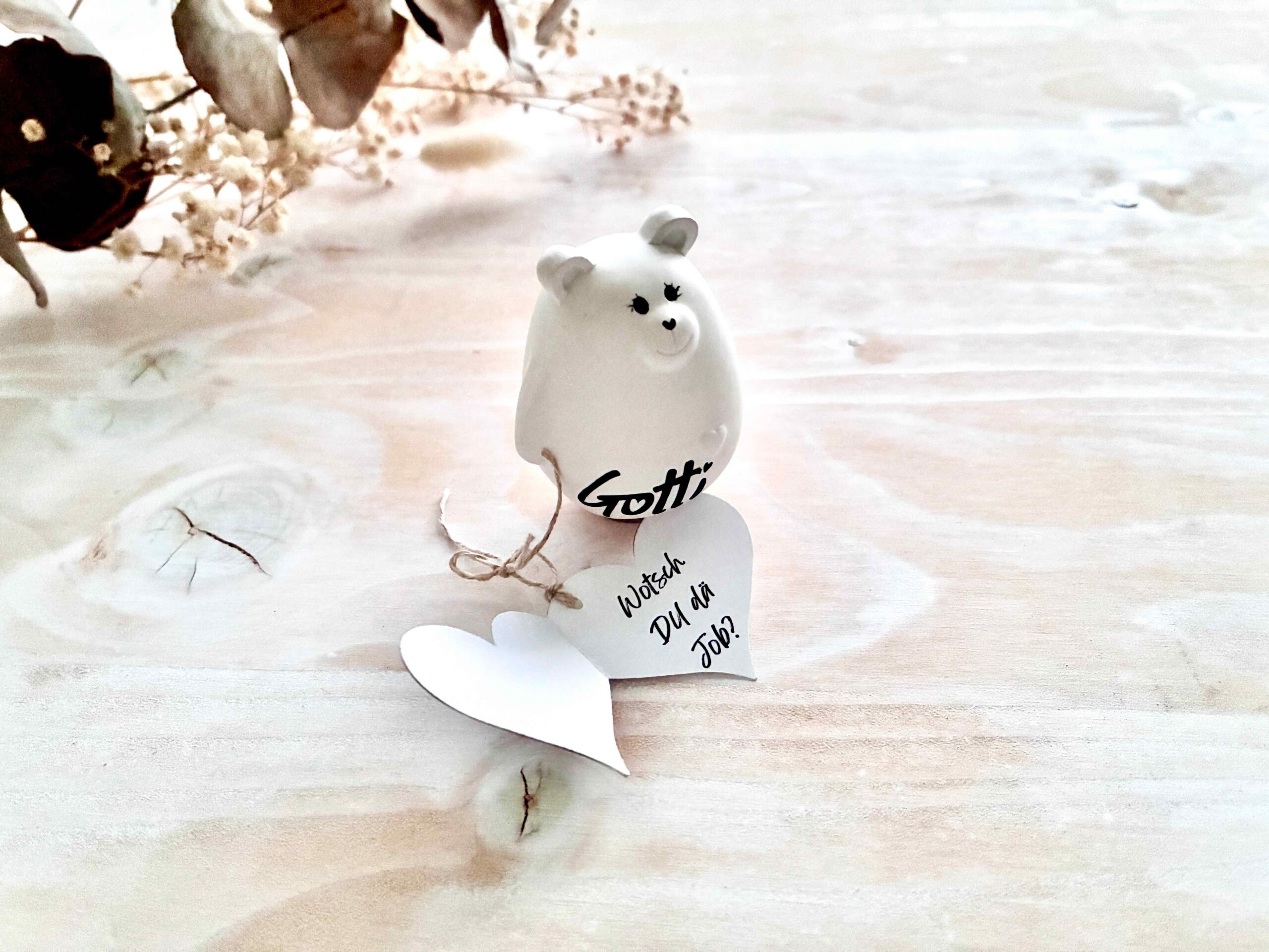 Dieser kleine handgegossene Bär trägt ein personalisiertes Herz-Kärtchen mit deiner ganz persönlichen Frage an die zukünftige Gotti oder den Götti – ein emotionaler Überraschungsmoment, der in Erinnerung bleibt.