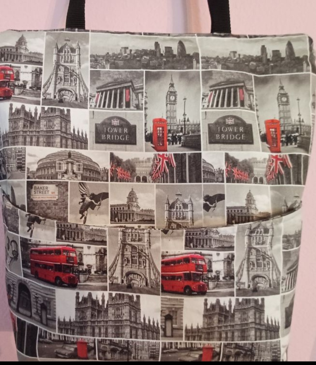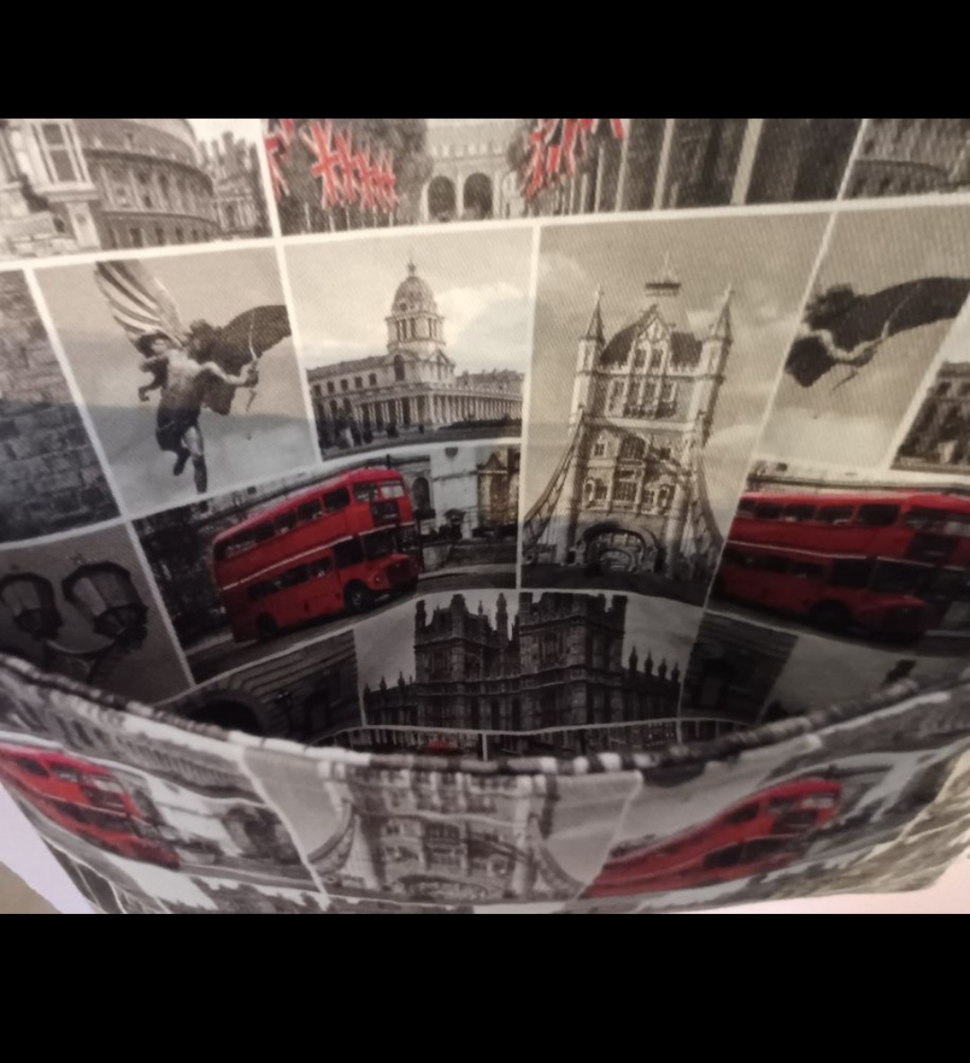Diese grosse geräumige Tasche wurde aus Baumwollköper mit London Motiv genäht. Dieses Material hällt so einigen Einkaufsbummeln stand und ist fast unverwüstbar. Aussen ist ein Fach für kleinigkeiten welche man schnell zur Hand haben will aufgenäht. Im inner ist ebenfals ein kleines Fach angebracht damit Kleinigkeiten nicht in den unendlichen weiten der Tasche verloren gehen. Das Innenfutter besteht aus starkem grauem Baumwollstoff.