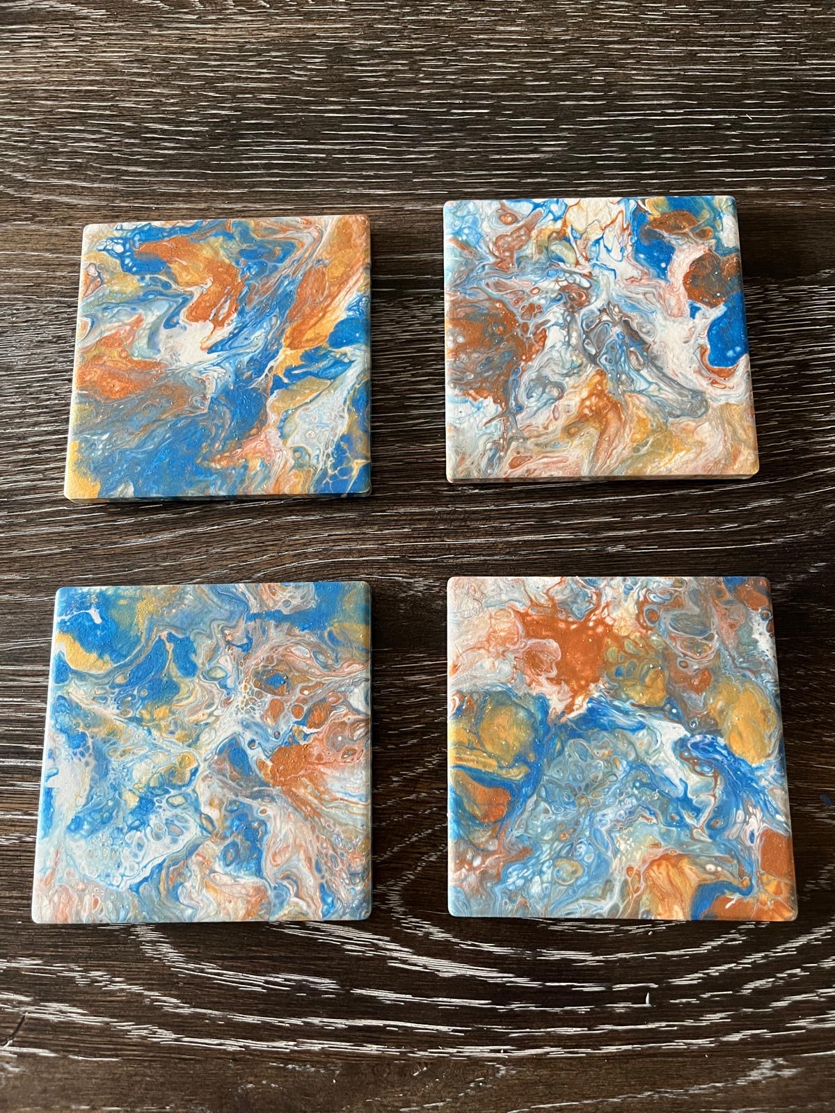 Einzigartige, handbemalte Keramikuntersetzer (4-er Set) mit Kork Rückseite, quadratisch in den Farben blau, gold, kupfer und weiss. Acrylic pouring Methode. Die Untersetzer wurden versiegelt und halten auch eine heisse Tasse aus.