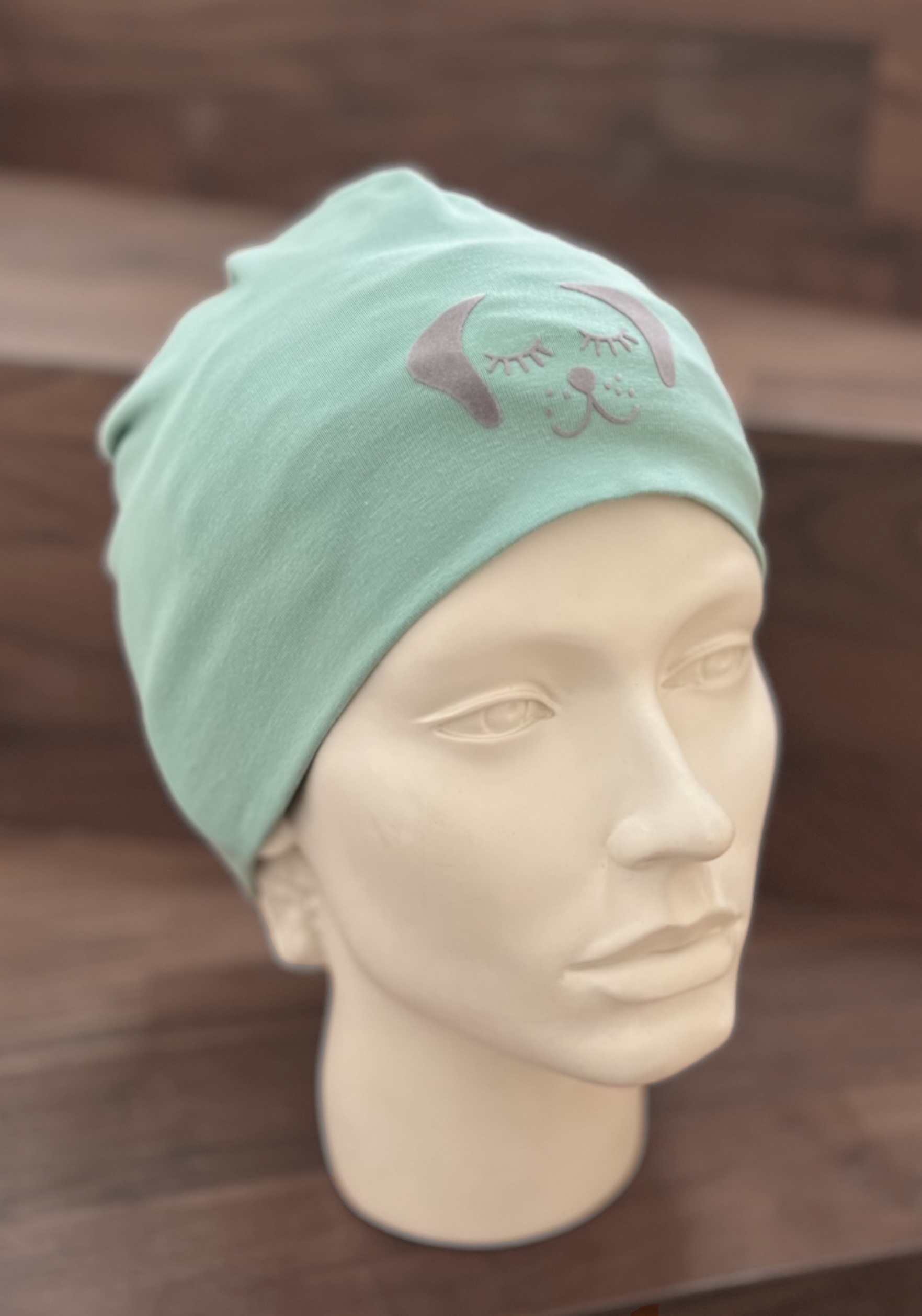 Doppelt genähte Mütze aus Baumwolljersey mit Plotterdruck.