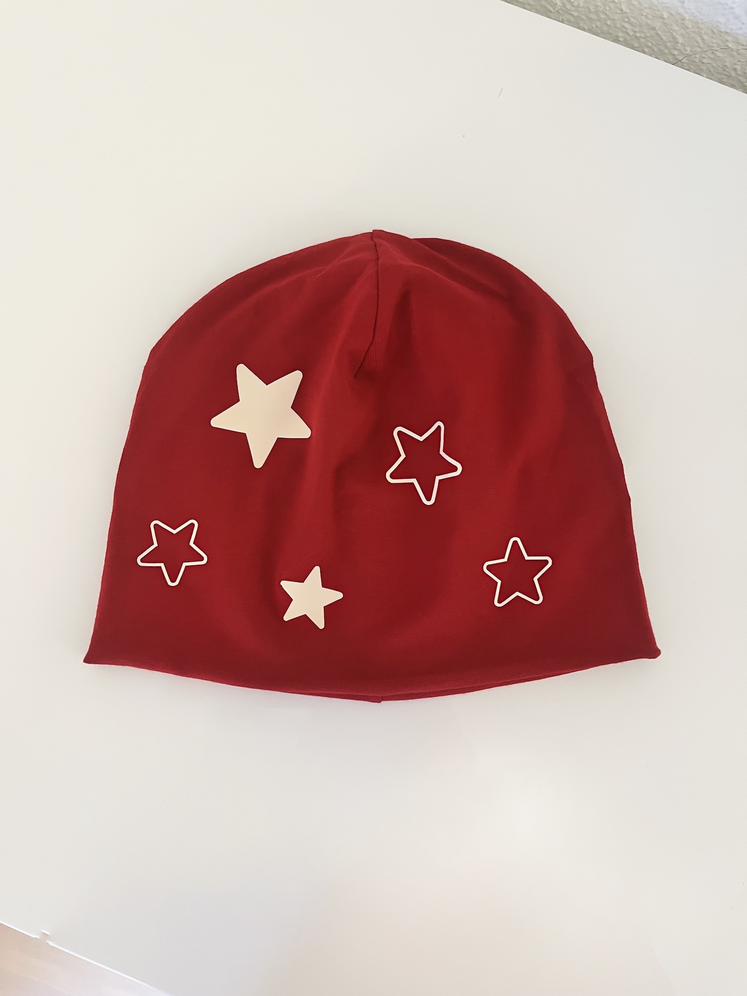 Doppelt genähte Mütze aus weichem Viscosejersey mit Plotterdruck. Die Sterne leuchten im dunkeln, da sie fluoreszierend sind