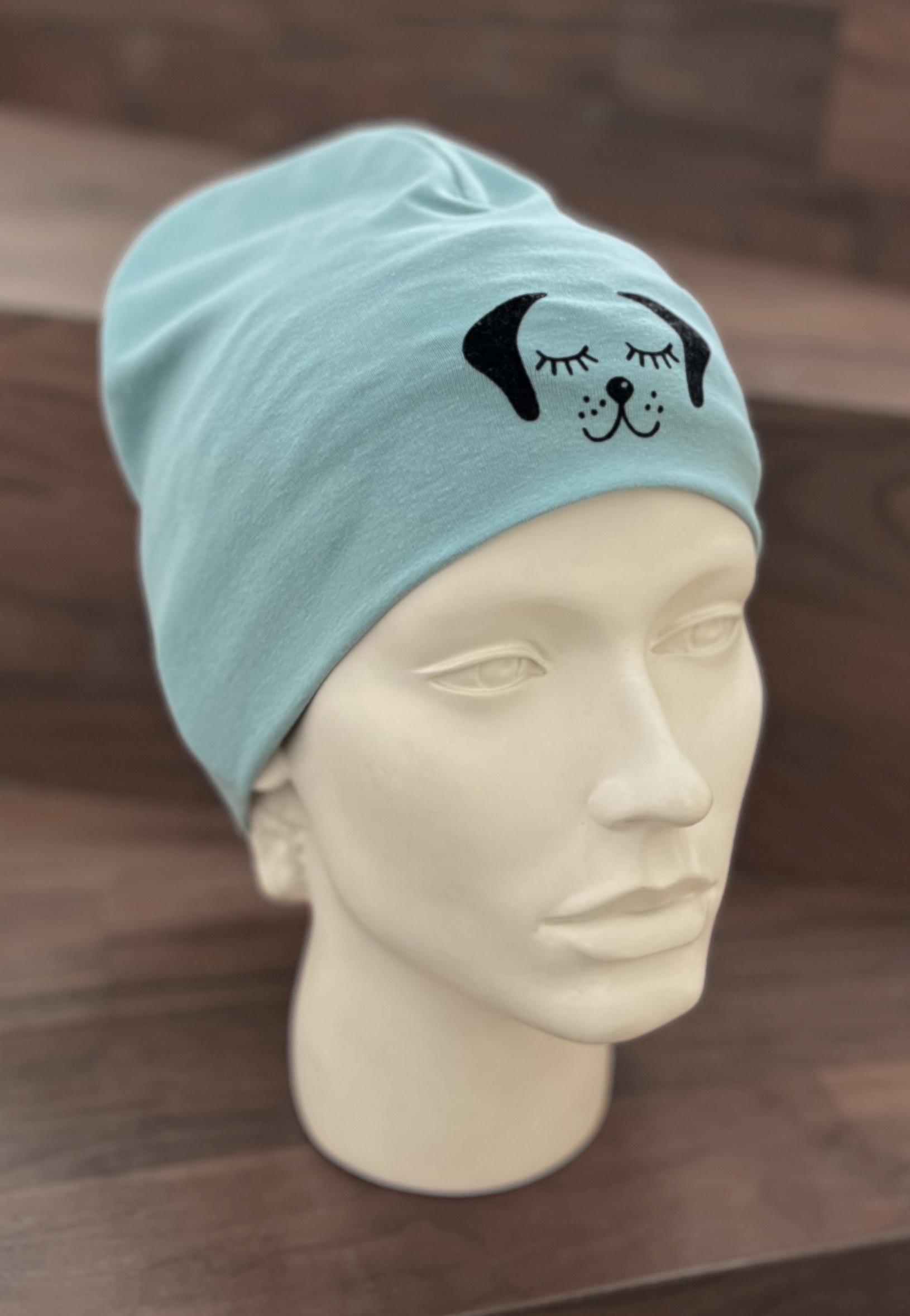 Doppelt genähte Mütze aus Baumwolljersey mit Plotterdruck.
