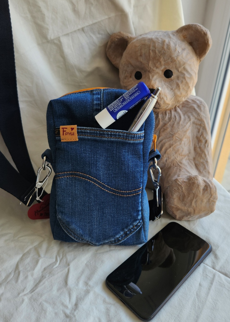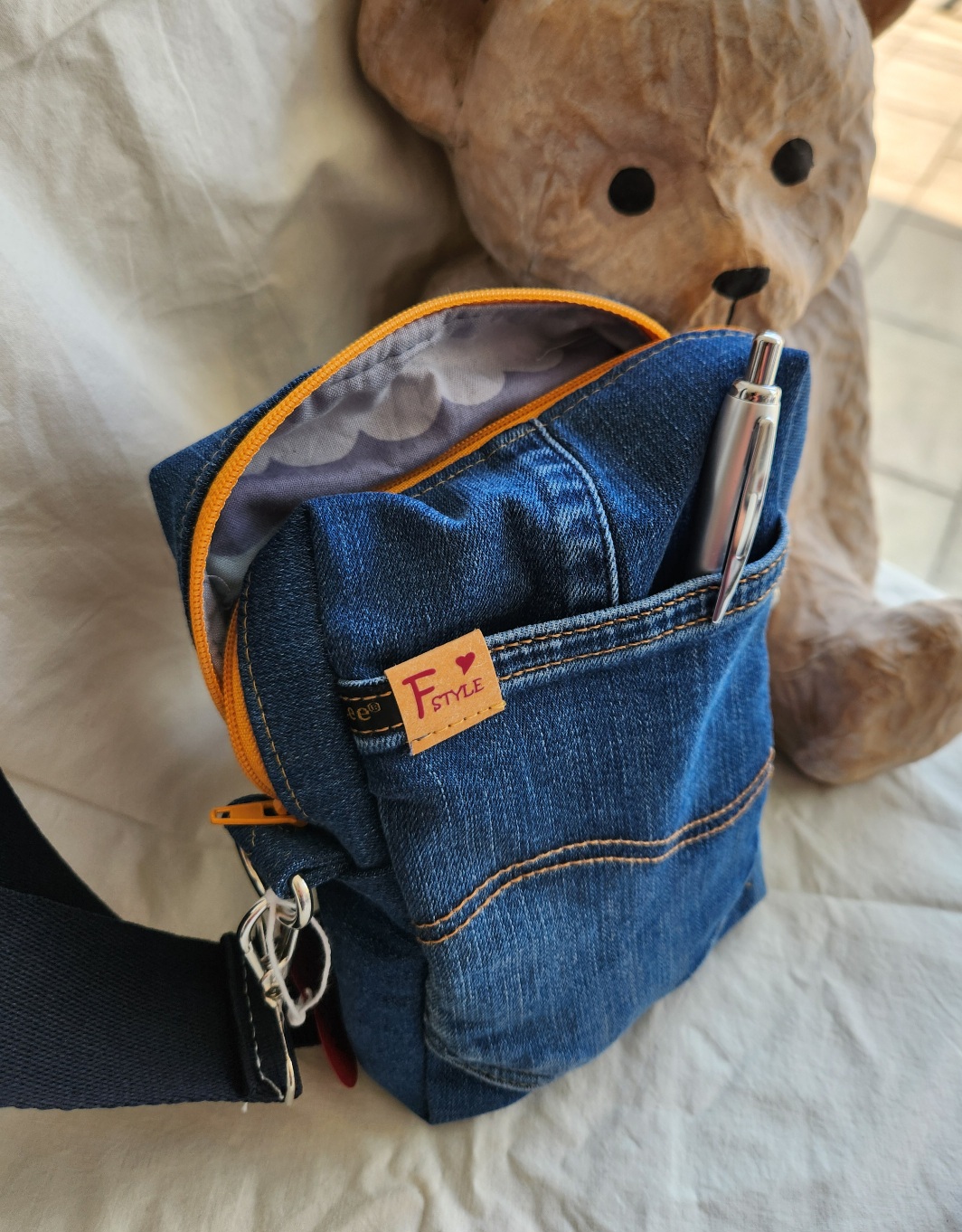 Genäht aus Jeans Upcycling und Baumwollstoff.