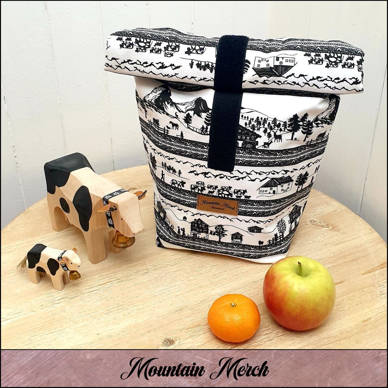 Dieses Lunchbag schliesst oben mit einem Klettband, variabel je nach Füllhöhe.