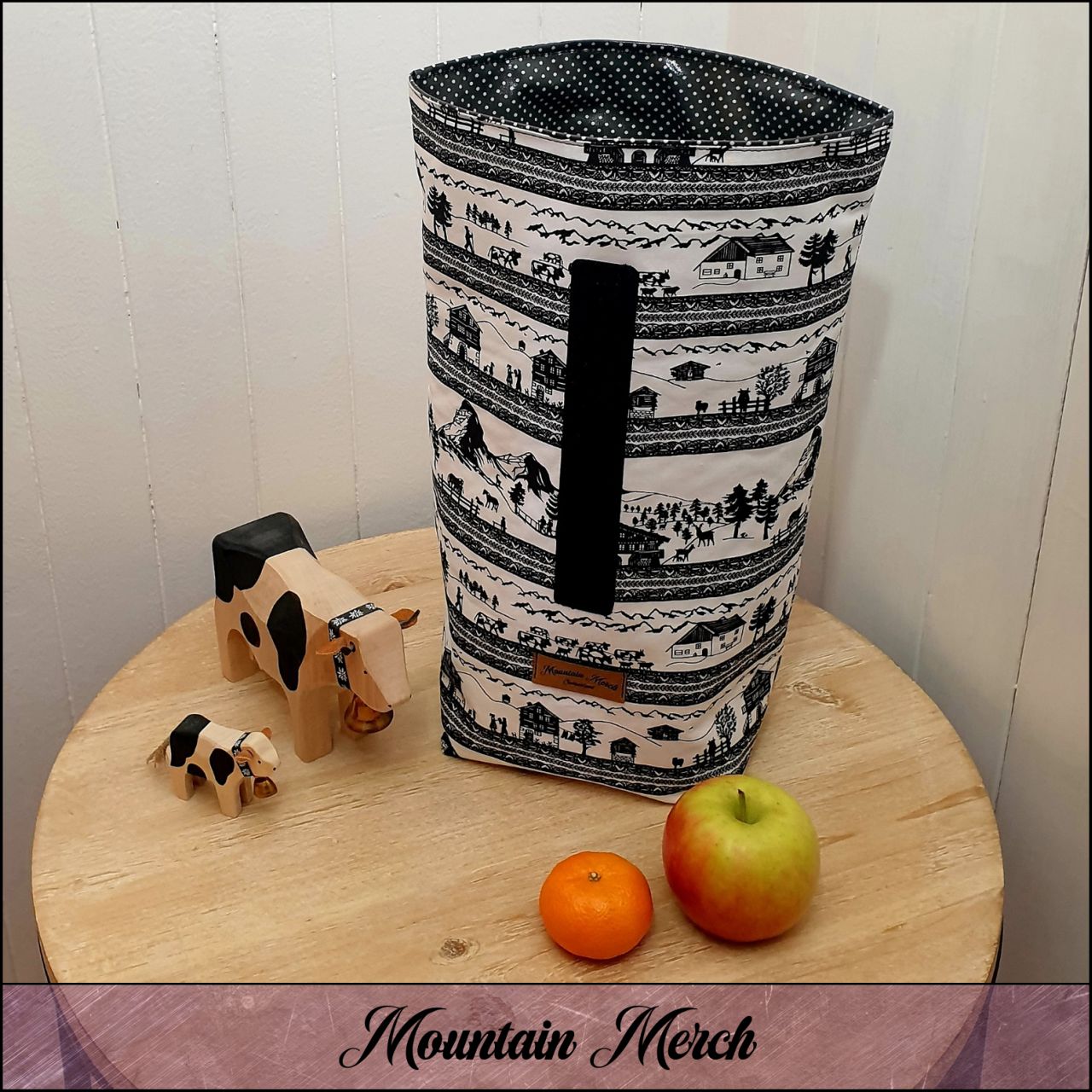 Aussen im Matterhorn Scherenschnitt Design aus Baumwolle, innen anthratzit mit weissen Punkten aus Wachstuch.