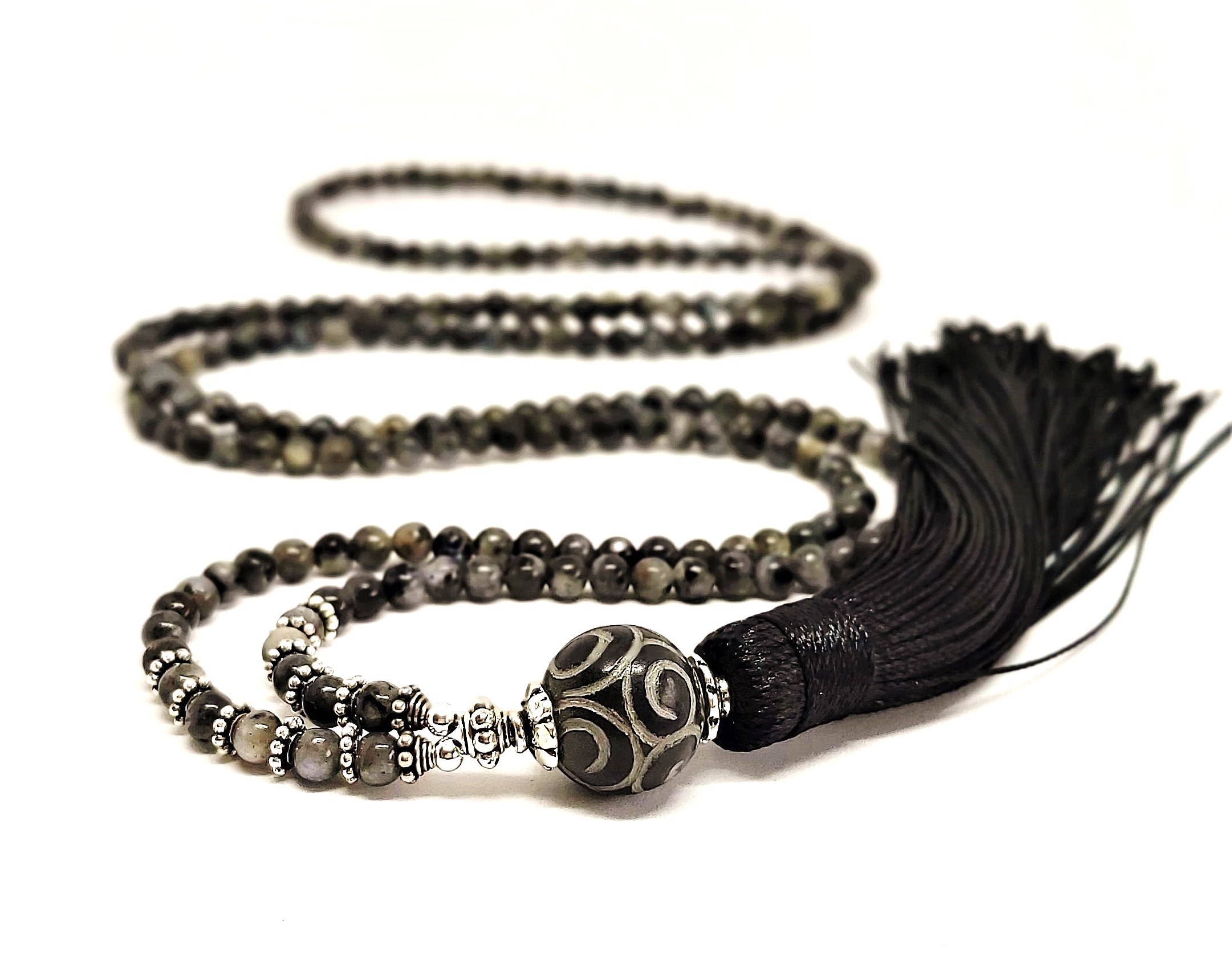 MALA 20: trendige Malakette in Grau-Silber, perfekt für jedes Outfit; bestehend aus grauen Labradoritperlen und Sterling Silberelementen. Ein schöner Anhänger bestehend aus einer schwarzen Nylonquaste und einer grossen, geschnitzten Jadeperle zieren das Ganze.