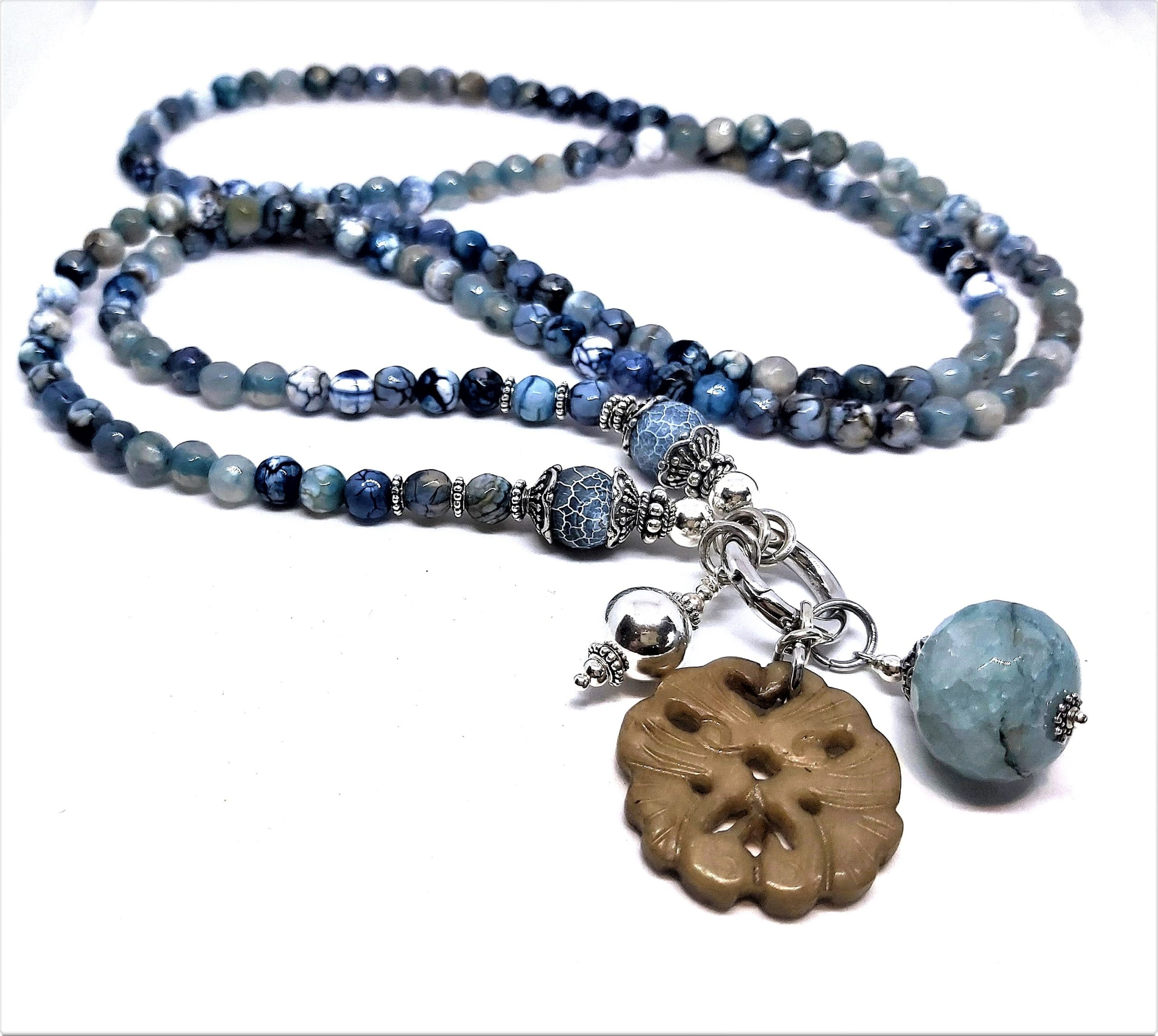 MILO: ein trendiger Halsschmuck im Bohemian-Style; bestehend aus hellblauen Achatperlen. Ein runder Karabinerhaken mit einem Achatanhänger, einem Silberanhänger, sowie einem flachen Jadeanhänger gebem der Kette das gewisse Etwas!