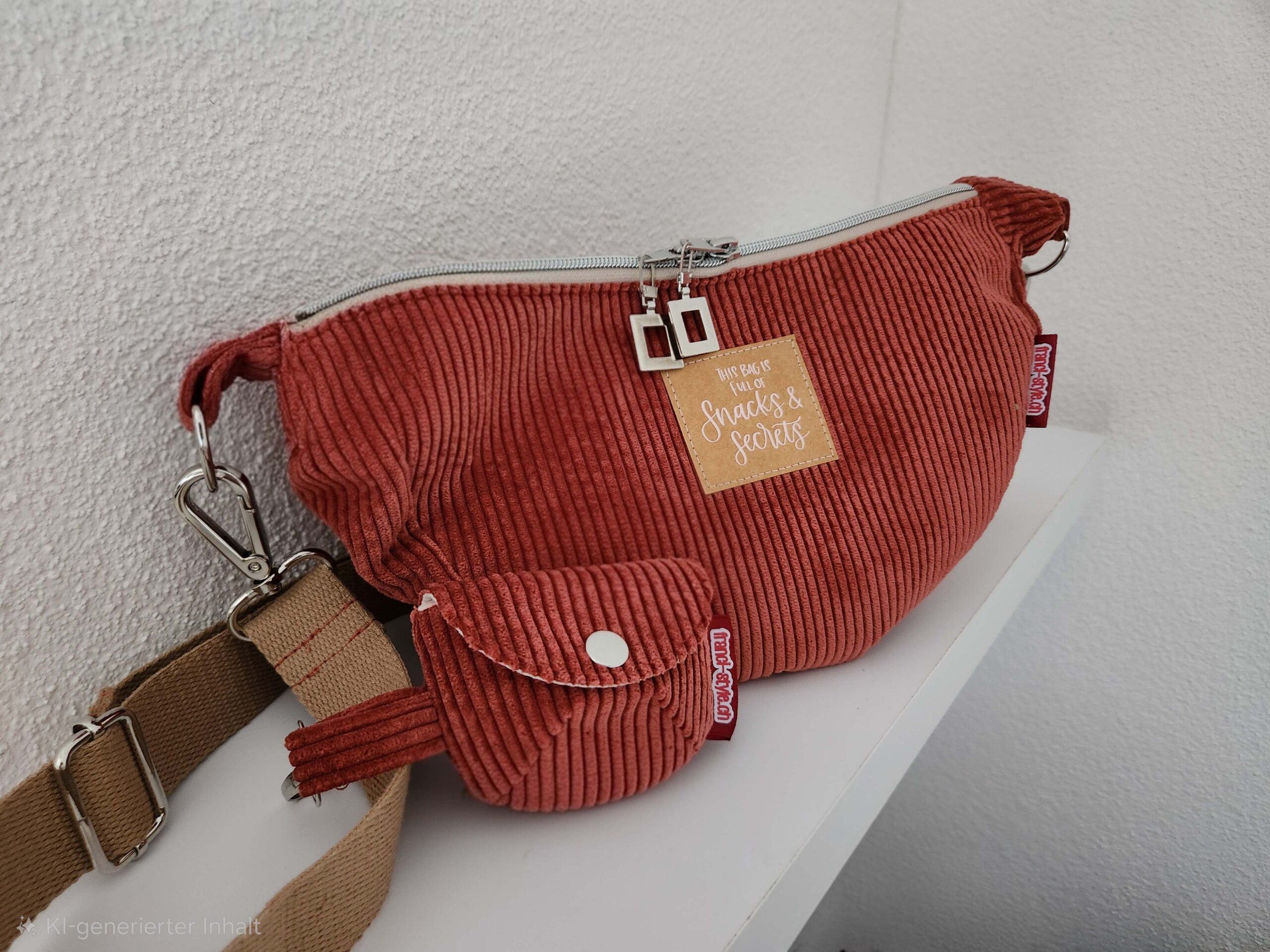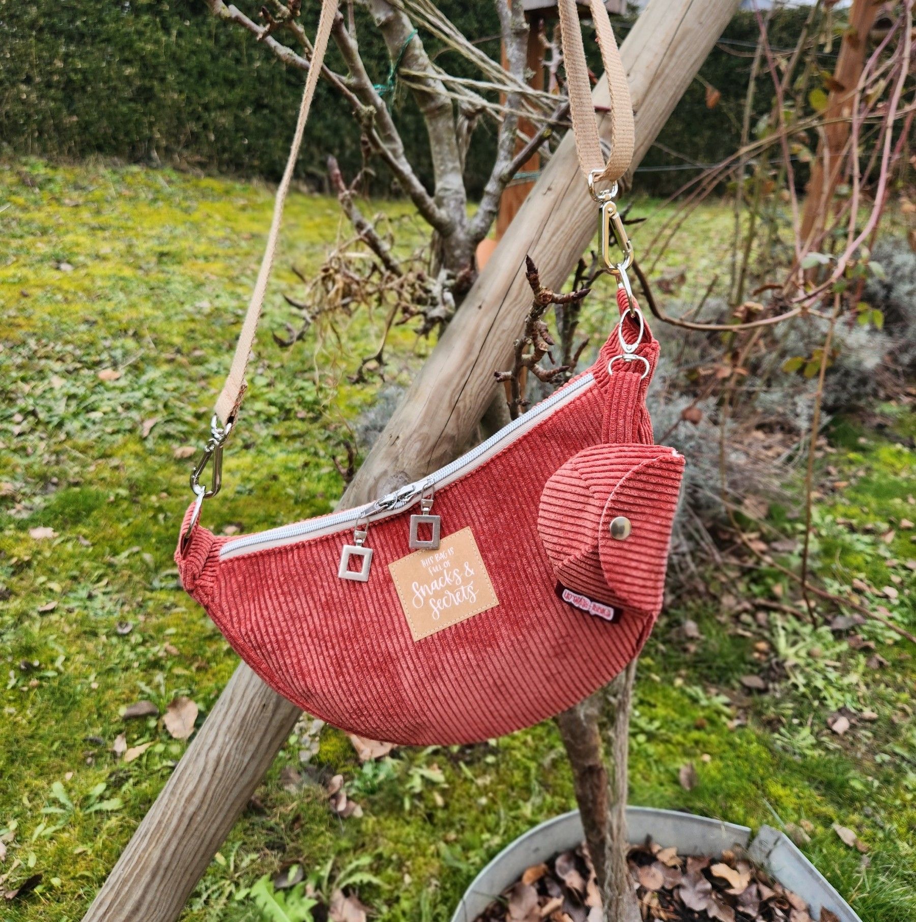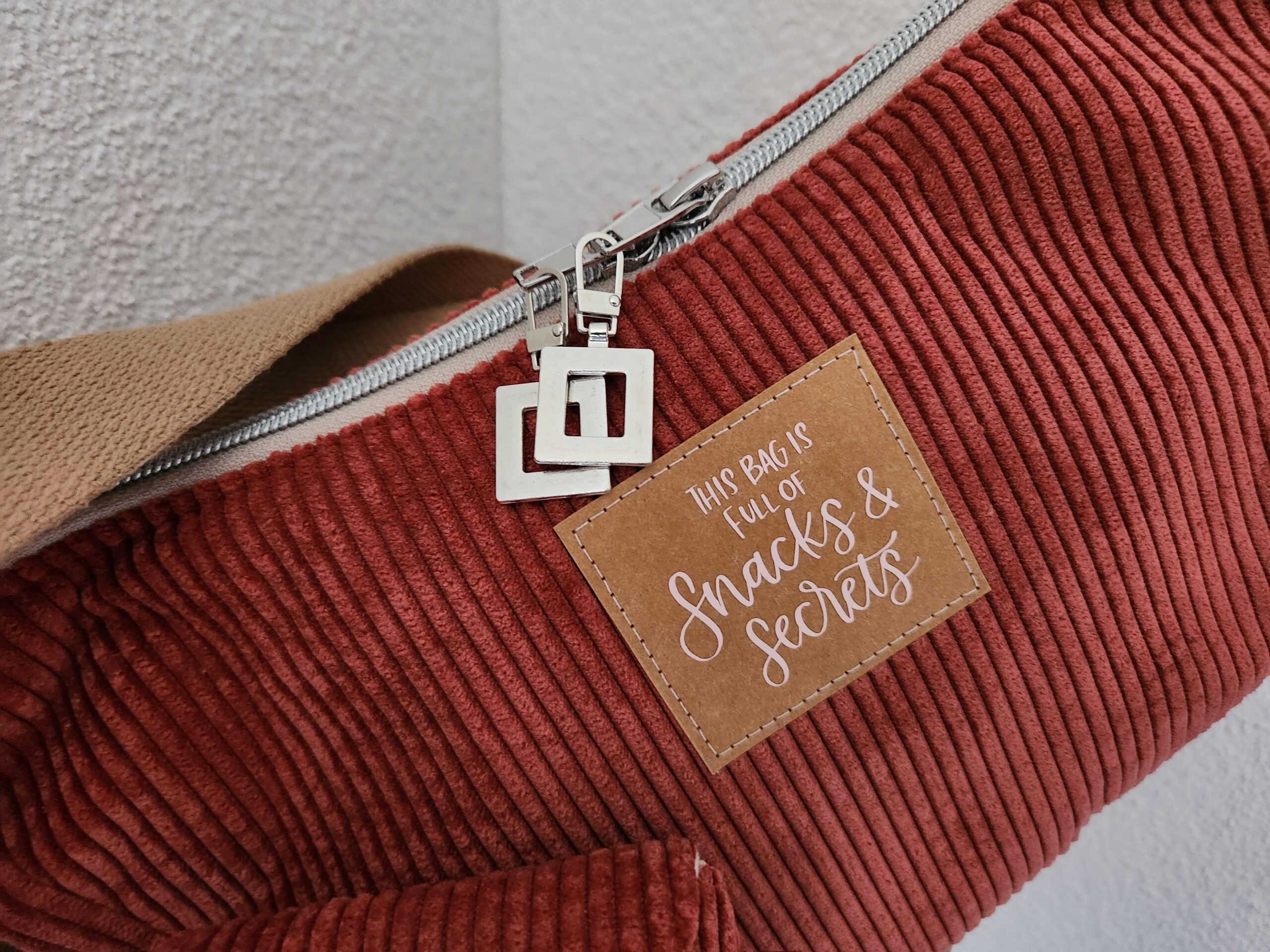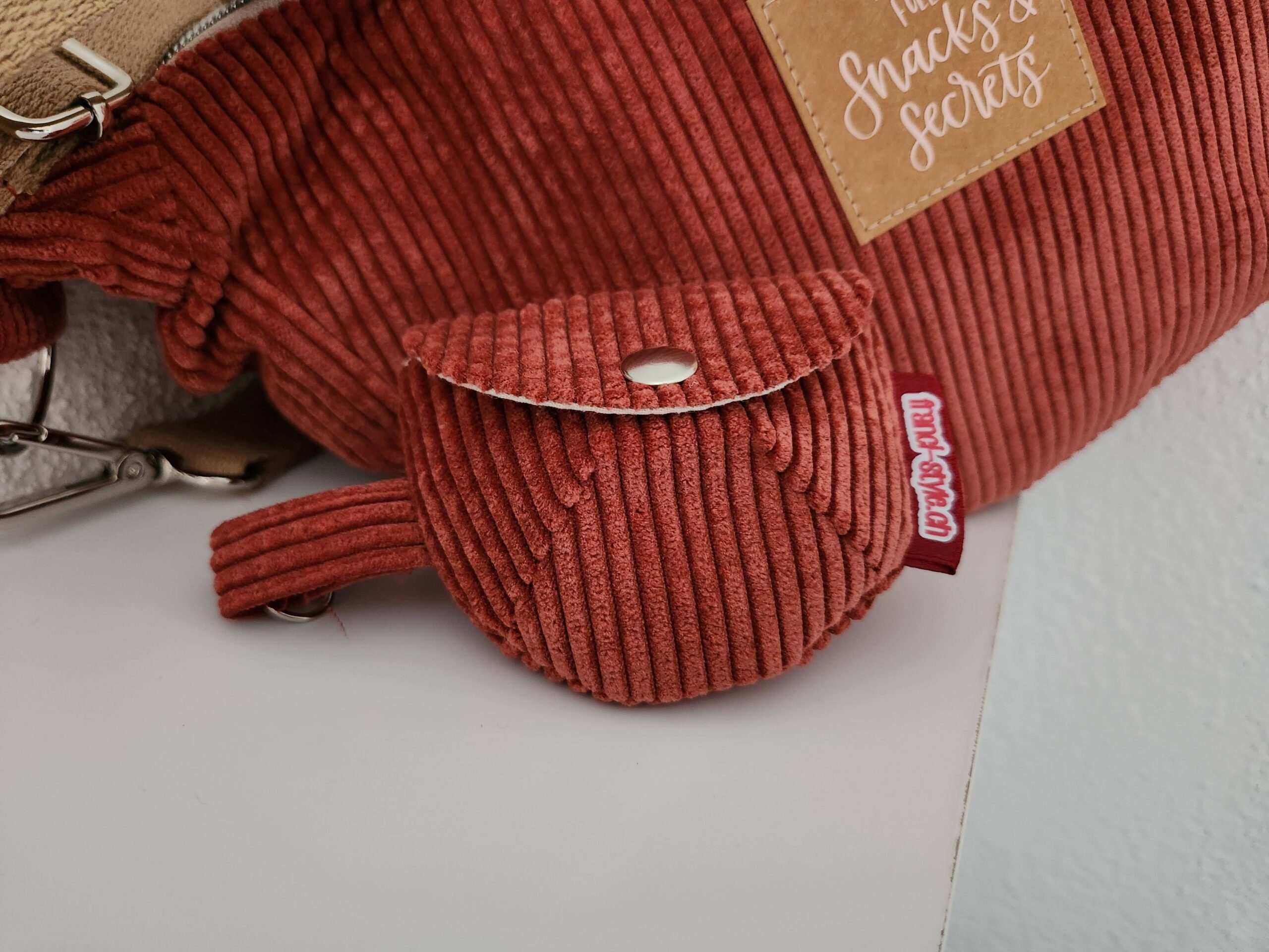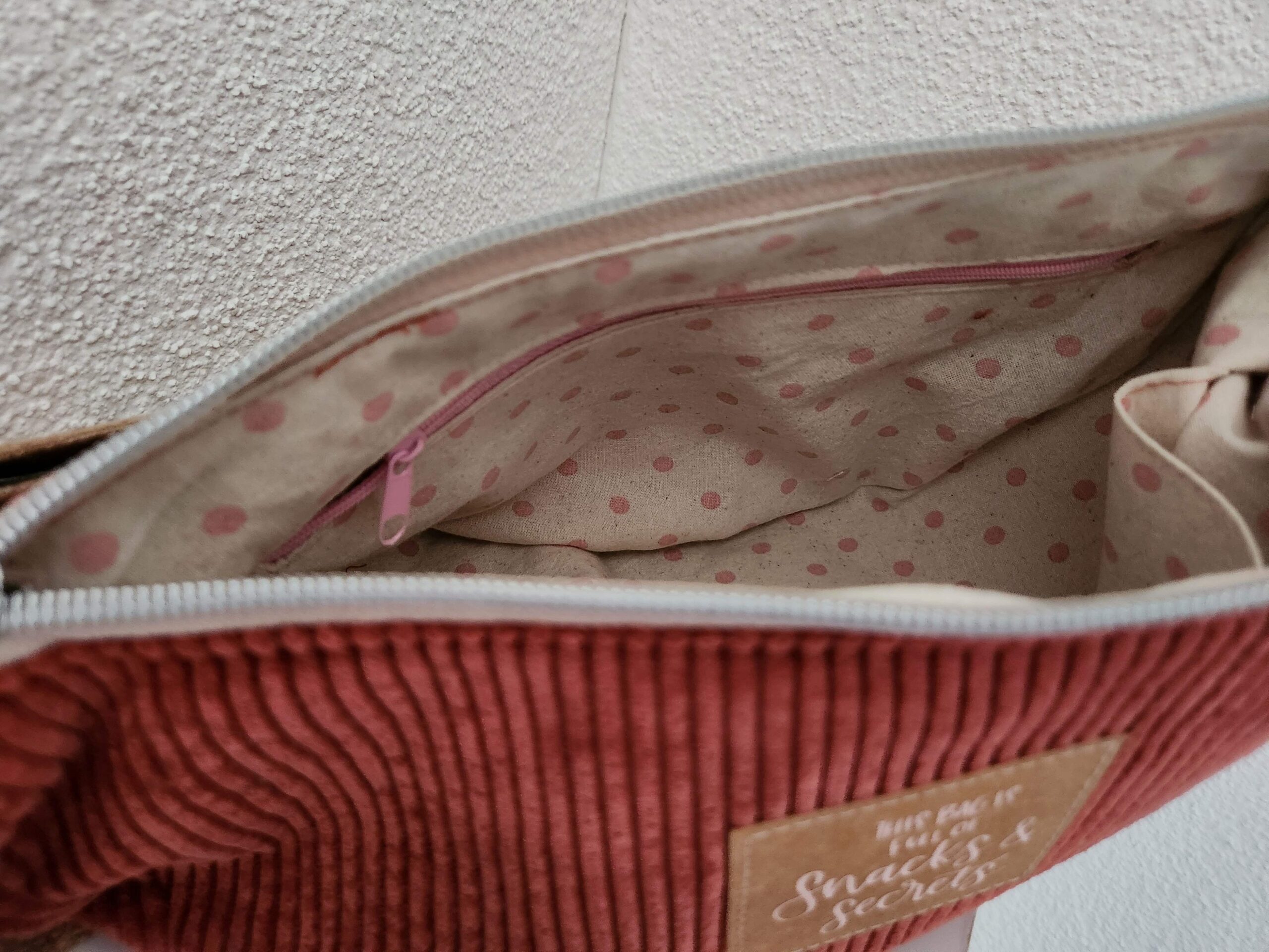Der Aussenstoff ist aus ziegelrotem Cord und innen ist Baumwollstoff.