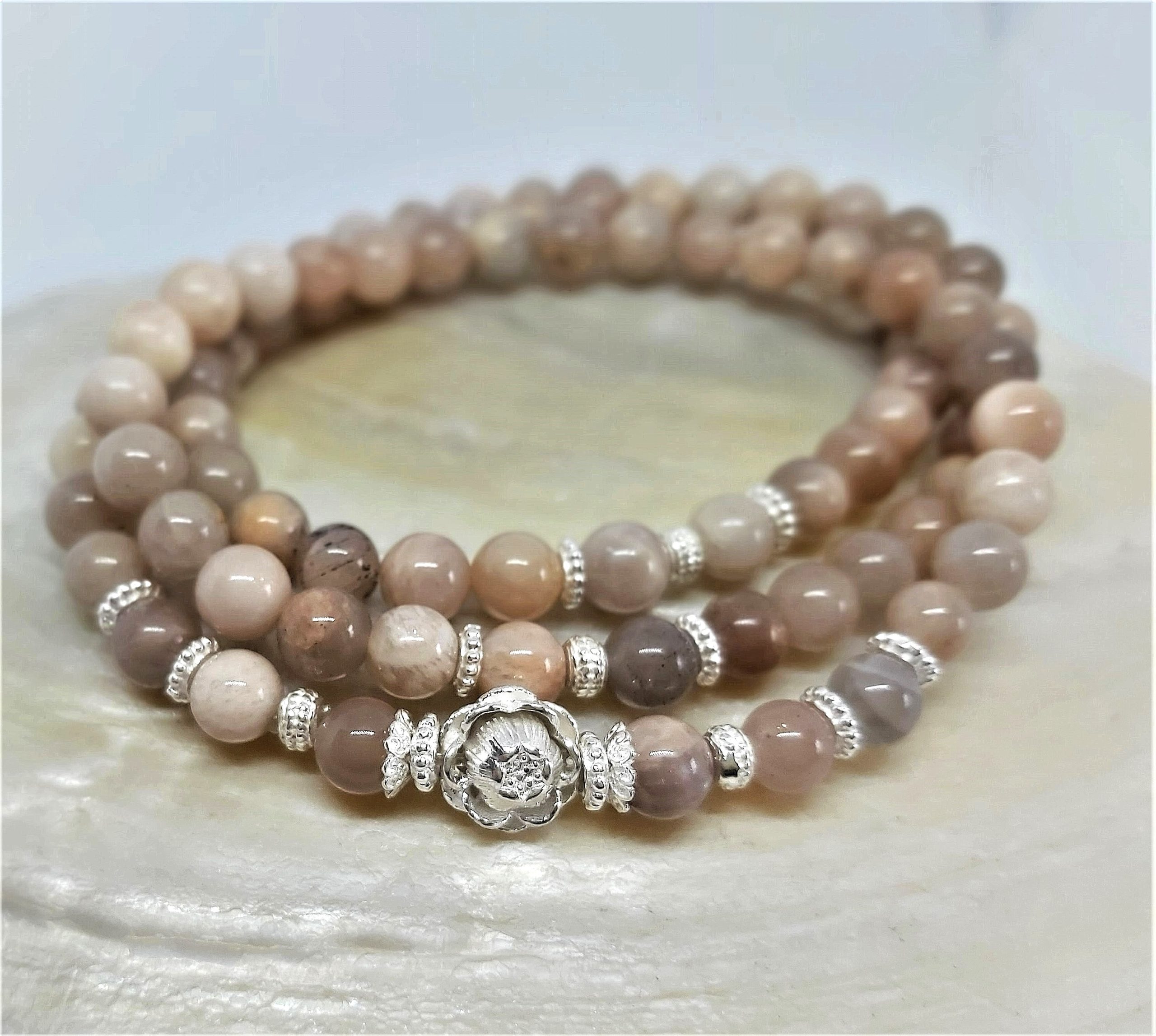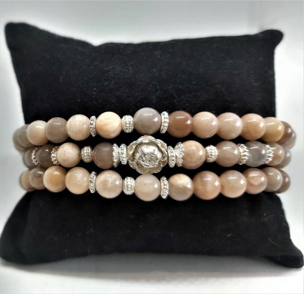 AMANDA: ein romantisches Perlenarmband, welches sich dreimal ums Handgelenk wickeln lässt. Es besteht aus runden, rosa-beigen Moonstoneperlen und wird mit Sterling Silber-Elementen kombiniert. Das Armand ist dehnbar und kann ganz einfach über das Handgelenk gezogen werden.