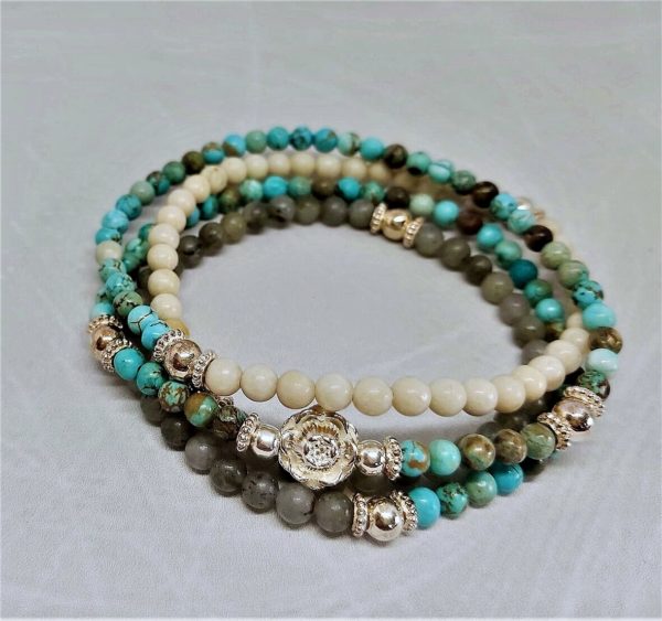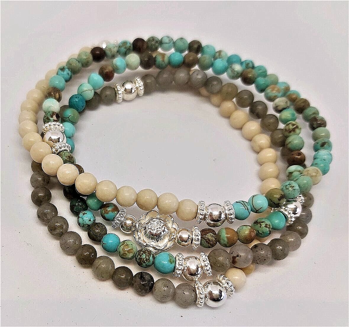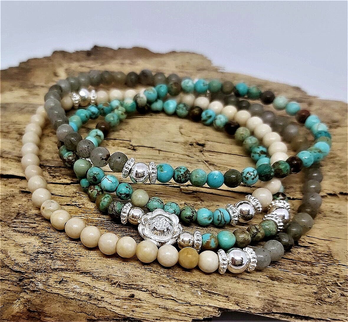 IBIZA: ein ein farbenfroher Armschmuck im Bohostyle, welcher sich viermal ums Handgelenk wickeln lässt. Es besteht aus Türkisperlen, écrufarbenen Fossilperlen, graugrünen Labradoritperlen, und wird mit Sterling Silber-Elementen kombiniert; das Armband ist dehnbar und kann ganz einfach übers Handgelenk gezogen werden.