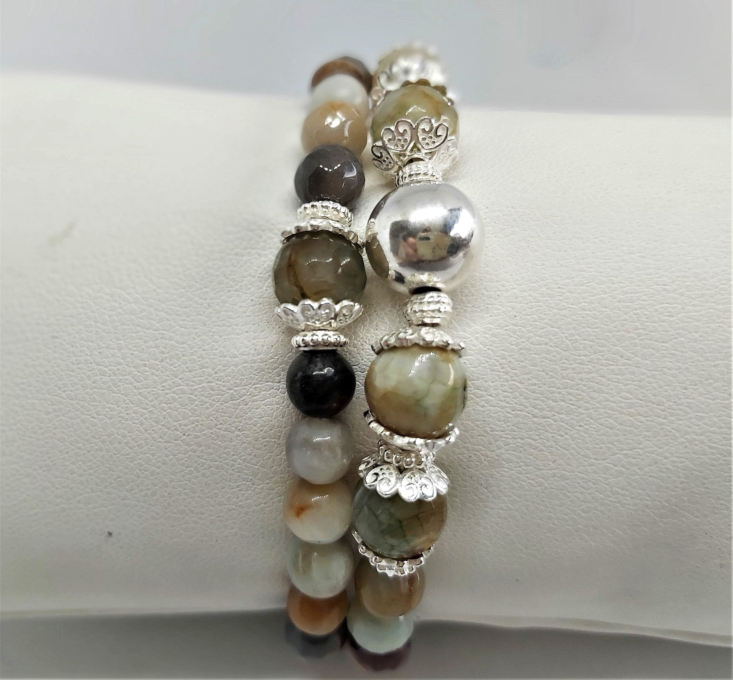 KIRA: ein trendiger Armschmuck; das Armband besteht aus kleineren Amazonitperlen und etwas grösseren Achatperlen, sowie Sterling Silber-Elementen und lässt sich 2x ums Handgelenk wickeln. Das Armband ist dehnbar und lässt sich ganz einfach anziehen.
