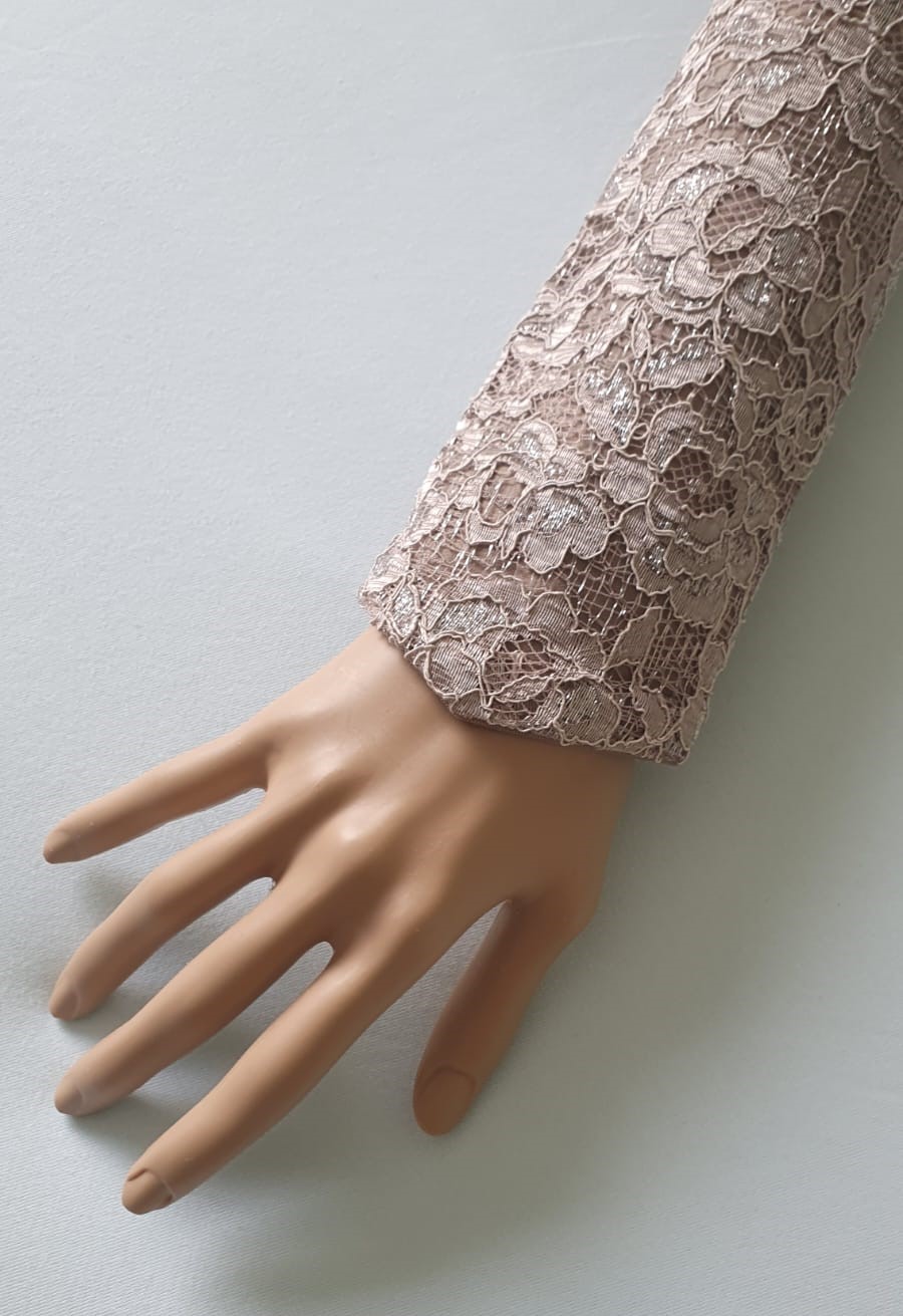 Das dekorative Blumenmuster ist aus Spitze und mit Silberfäden verarbeitet.