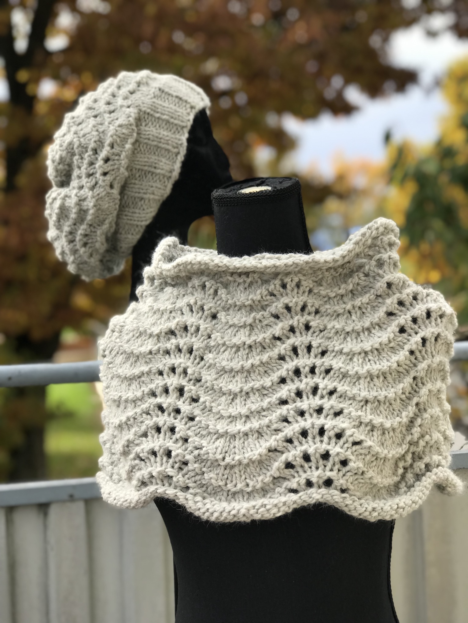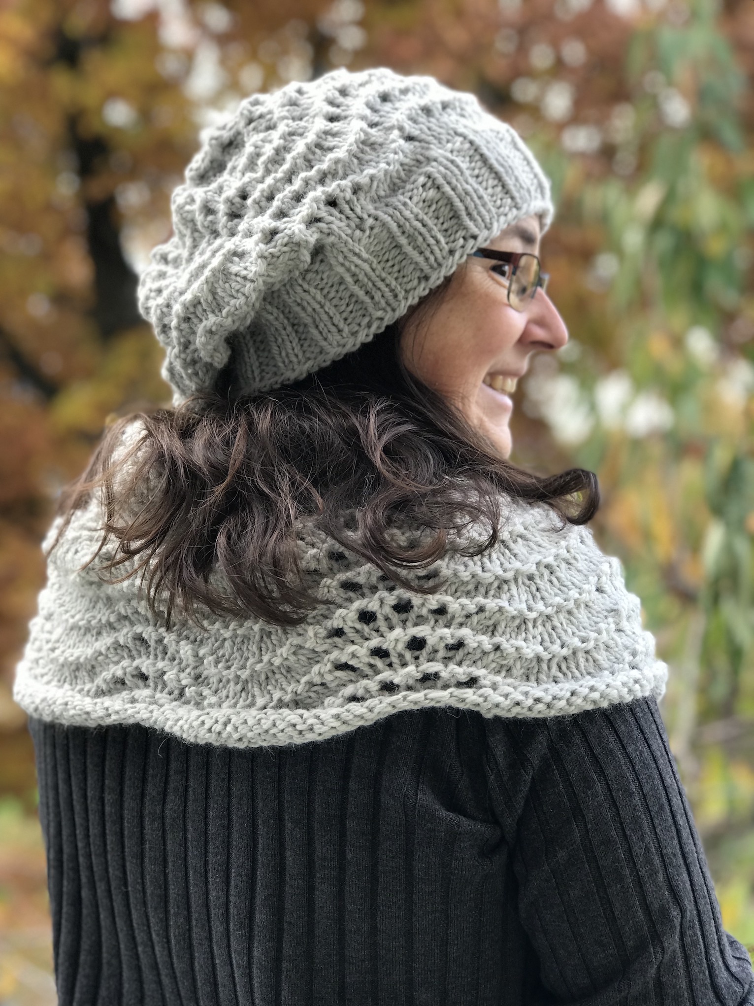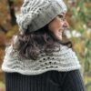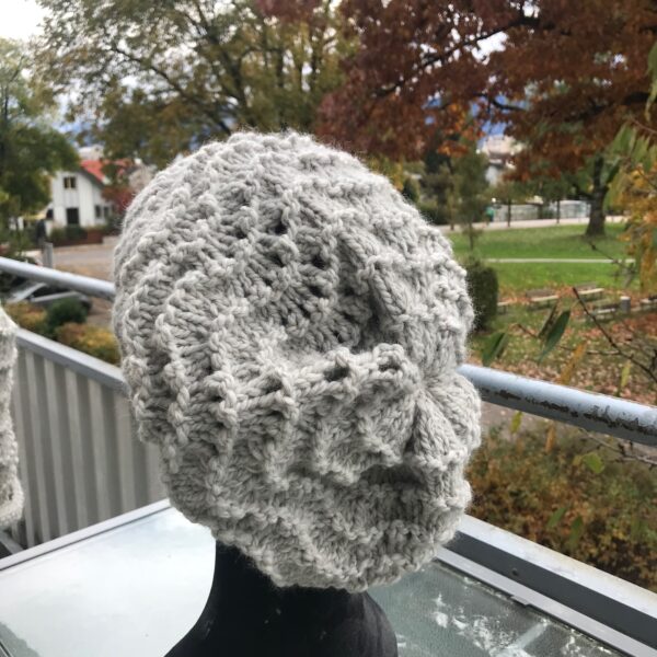 Ein super warmes Set mit Mütze und Kragenschal in einem wunderschönen Hellgrau, gestrickt mit Wellenmuster.