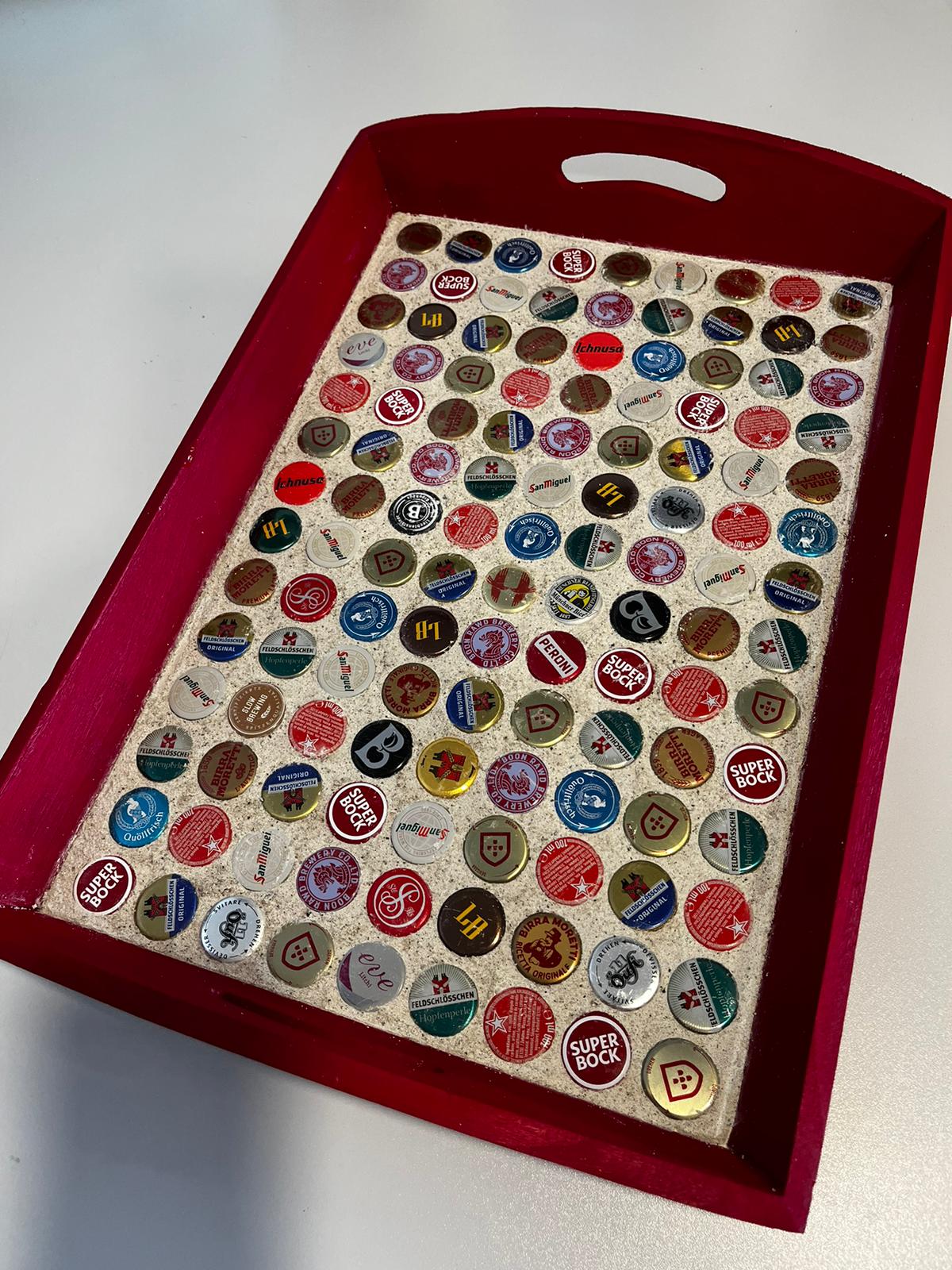 Serviertablett mit Bierverschlüssen