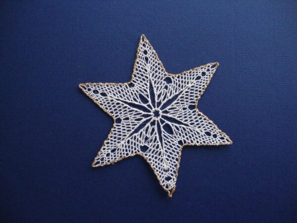Handgeklöppelter Stern in weiss mit Goldrand.