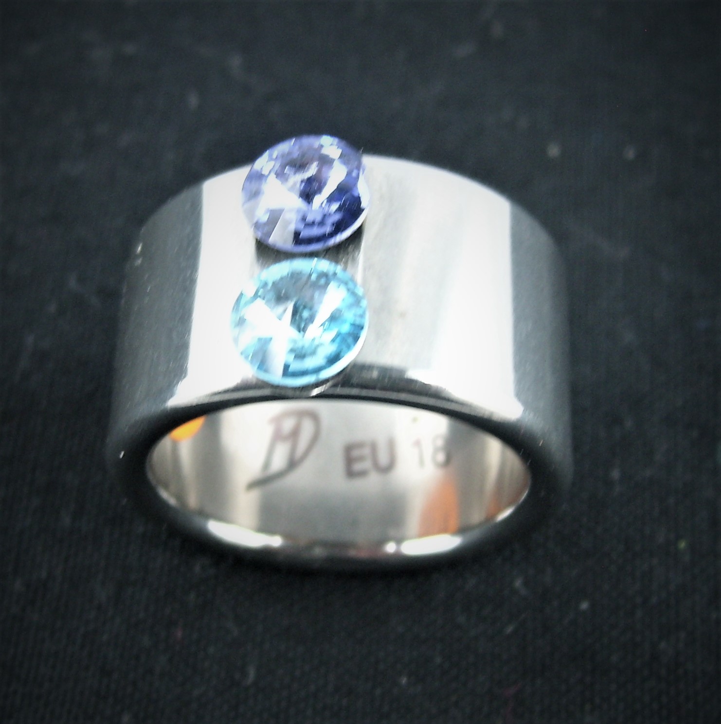 Aussergewöhnlicher Swarovski-Ring mit zwei Steinen in hellblau und lila, Gr. 18. Ringbreite ca. 1cm.