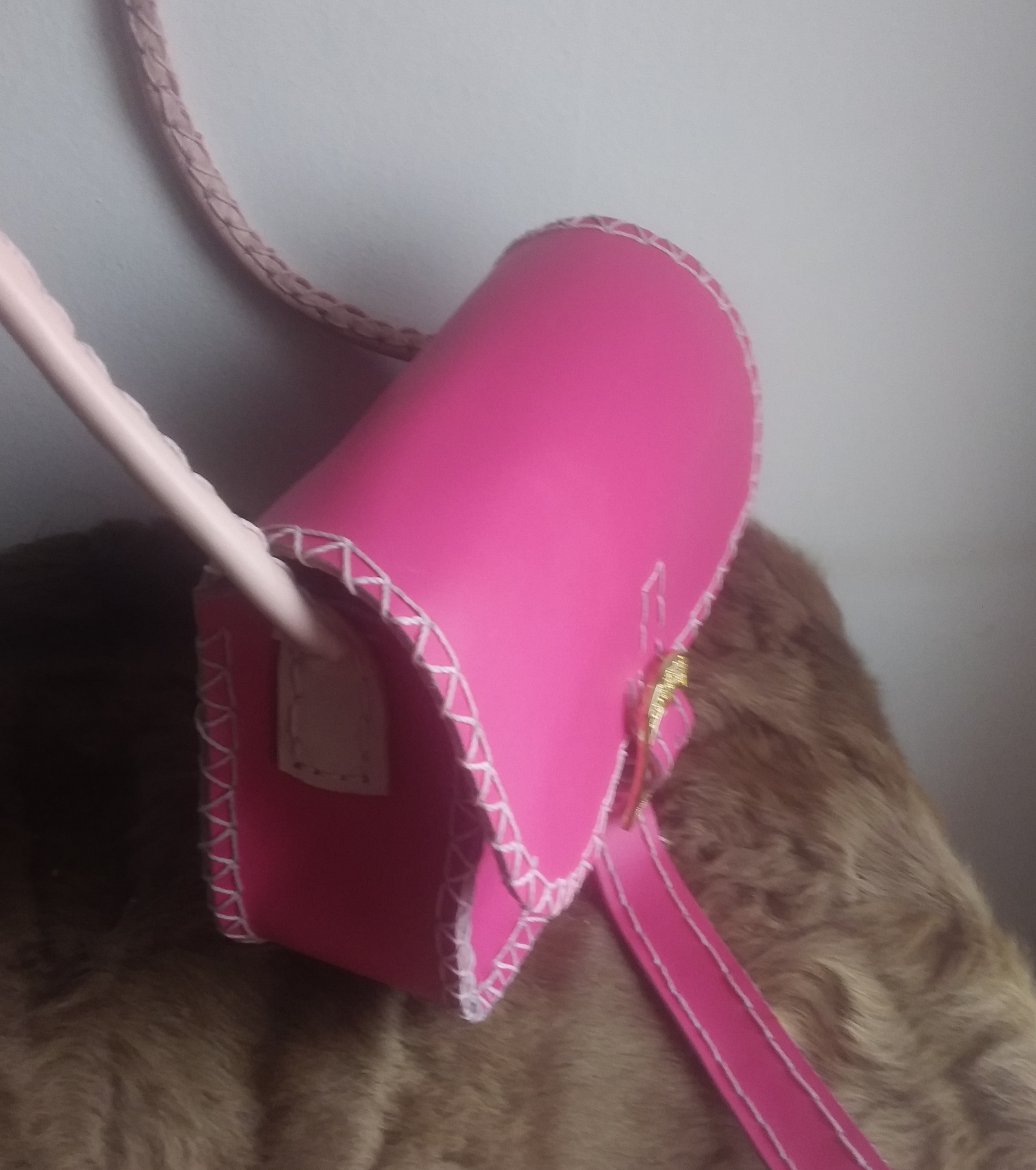Handtasche mit Schulterriemen. Aussen Pink, innen Rosa. Leder. Schulterriemen in Rosa, rundgenäht. Alles Handgenäht, auch Schulterriemen. Masse: 13×13/16cm. Tiefe: 5cm. Mit Schnallenverschluss.