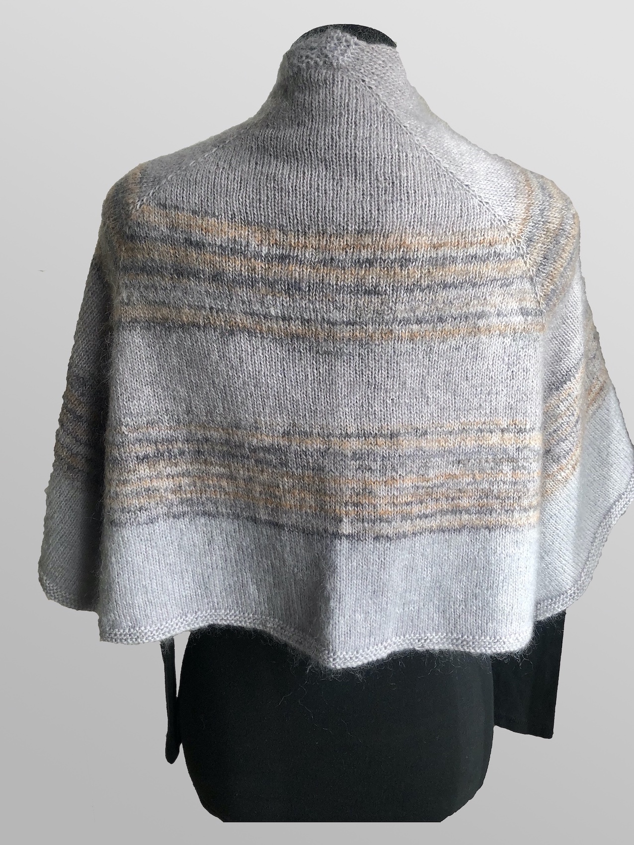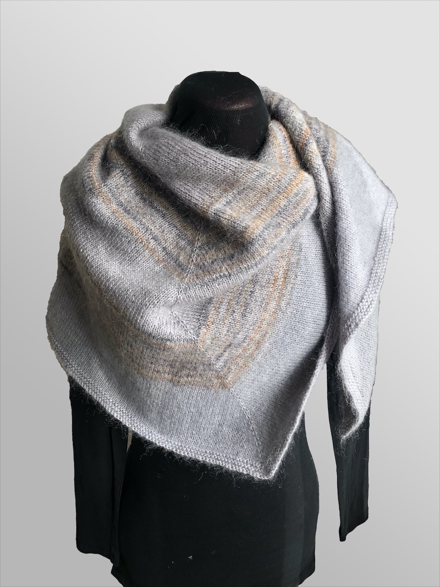 Von Hand gestricktes Tuch aus Merino und Mohairwolle. Es wärmt Schulter und Rücken. Das helle grau mit den beigen Farbverlaufsakzenten kann sehr vielseitig kombiniert werden.