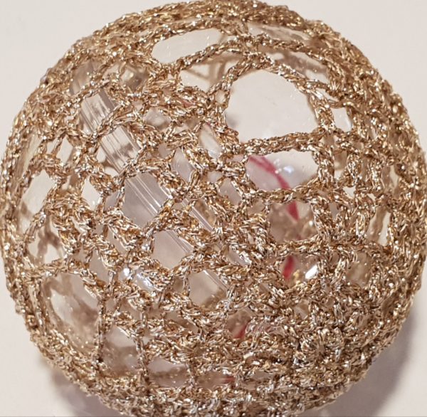 Die Plexiglaskugel wurde mit Baumwollgarn umhäkelt