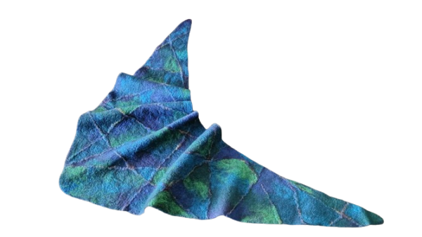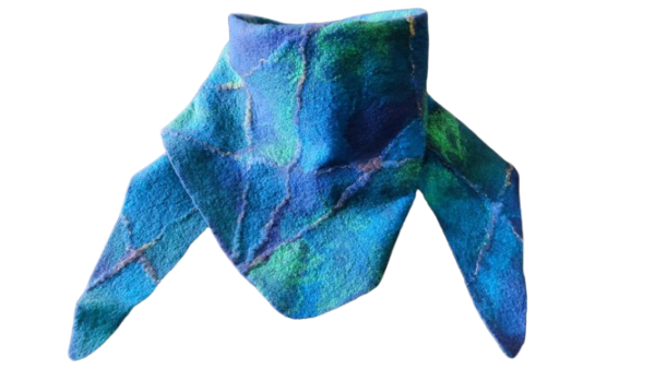Wunderschönes, handgefertigtes Dreieckstuch aus feiner Merinowolle in Blau- und Grüntönen. Die Wolle ist angenehm weich und kratzt nicht. Das Tuch wurde in Nassfilztechnik hergestellt und ist ein Unikat. Durch die verschiedenen Tragemöglichkeiten ist es ein vielseitiges Accessoire für jede Jahreszeit. Perfekt für kühle Sommerabende oder als wärmender Begleiter im Winter. Das Tuch ist neu und ungetragen.